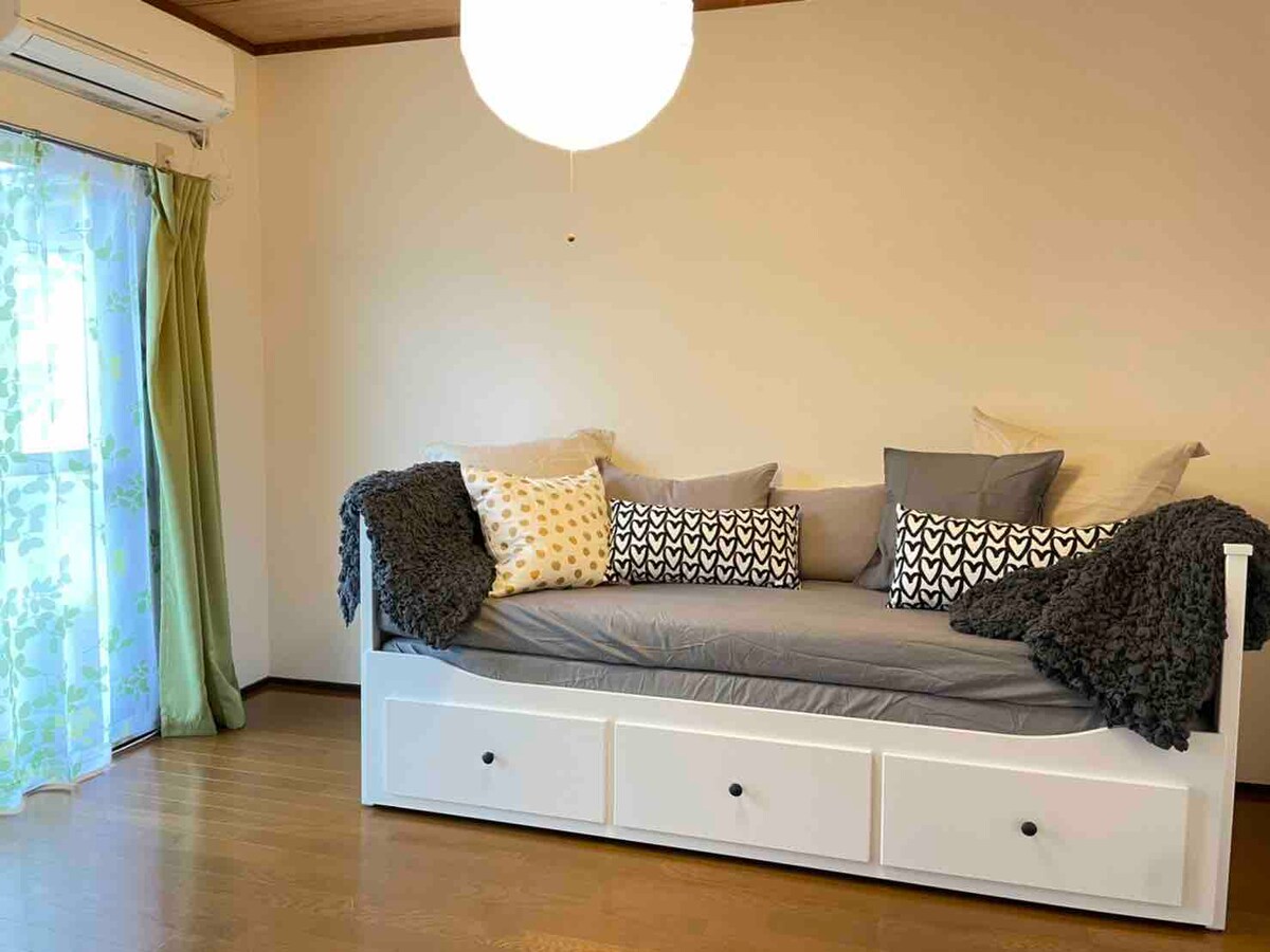 こちらのお部屋は、アパートの二階にある、1室2LDKのお部屋です。建物は築30年経ってます。 お風呂、トイレは別々になります。トイレはタンク式で、連続して水を流す事は出来ません。水がタンクに溜まりましたら、流す事が出来ます。 ベットは、シモンズ製のベットとソファベッド、お布団が3組ございます。基本的な寝具のセットは、ベッドを優先してセッティングをします。ご要望が有る場合には、事前にメッセージをください。 キッチンはお料理出来るようにお鍋やフライパンなども準備しています。 バスタオル、タオル、シャンプー、リンス、洗濯洗剤などのアメニティもございます。歯ブラシは環境保護の為に、置いてません。ご持参ください。