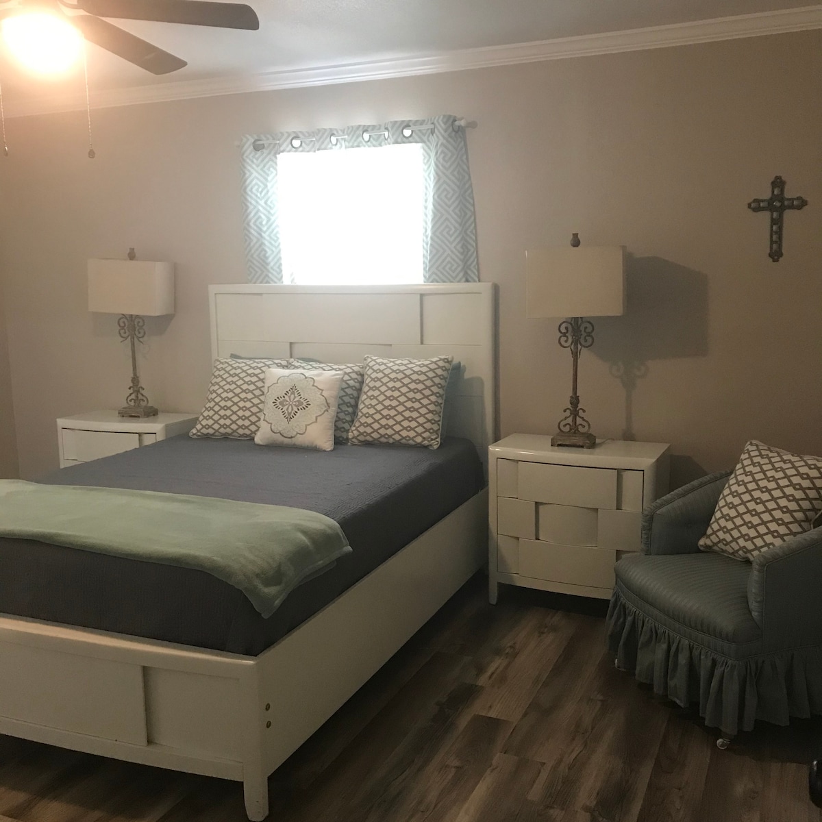 中心部に位置する落ち着いた宿泊先に滞在して、旅をシンプルに楽しみましょう。 都市部にあります。 両方の病院まで徒歩圏内です。 近くにバス停があります。レストランまで徒歩圏内です。 禁煙・ペット不可。 フルサイズベッド。電子レンジ、小さな冷蔵庫、コーヒーポット。 コンロ、洗濯機、乾燥機はありません 専用玄関、敷地内の駐車場。 このワンルームは家の裏側にあります。 寝室には接続する壁はありません。 AC/ヒーターは共用で、サーモスタットは家の中にありますが、ワンルームは快適な温度に保たれています。
