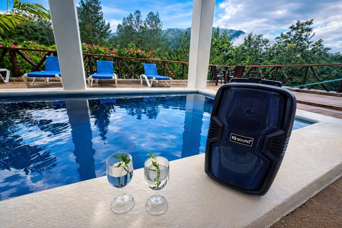A breathtaking mountain view, with pool, jacuzzi, basketball court, ping pong table, charcoal BBQ, 5 bedrooms/5 bathrooms with fans and all with optional AC, inverter for emergency power outages, equipped kitchen, private parking, and more... Maximum capacity of 12 people. An additional fee of USD $15 per person should be paid if your reservation exceeds 8 people. ALL electricity is INCLUDED except for air conditioners. A USD $100 deposit is collected at arrival if the optional ACs are used.