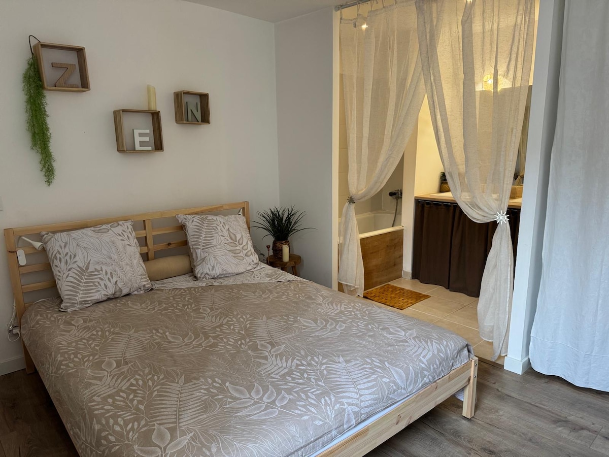 自然との触れ合いの中で、贅沢とプライバシーを。このロフトは、プライベートなジャグジー、モダンな暖炉、キングサイズベッド、小さな庭、ロマンチックな夜のためのバーベキューなど、リラックスした時間をお過ごしいただけます。キッチン設備完備、デリバリーサービス、ご要望に応じてシャンパンボックスをご用意。セルフチェックイン、専用駐車場、Uberでアクセス可能(駅または空港)。モンペリエから15分、ビーチから35分。完璧な滞在と忘れられない瞬間のためのモダンさと静けさ。