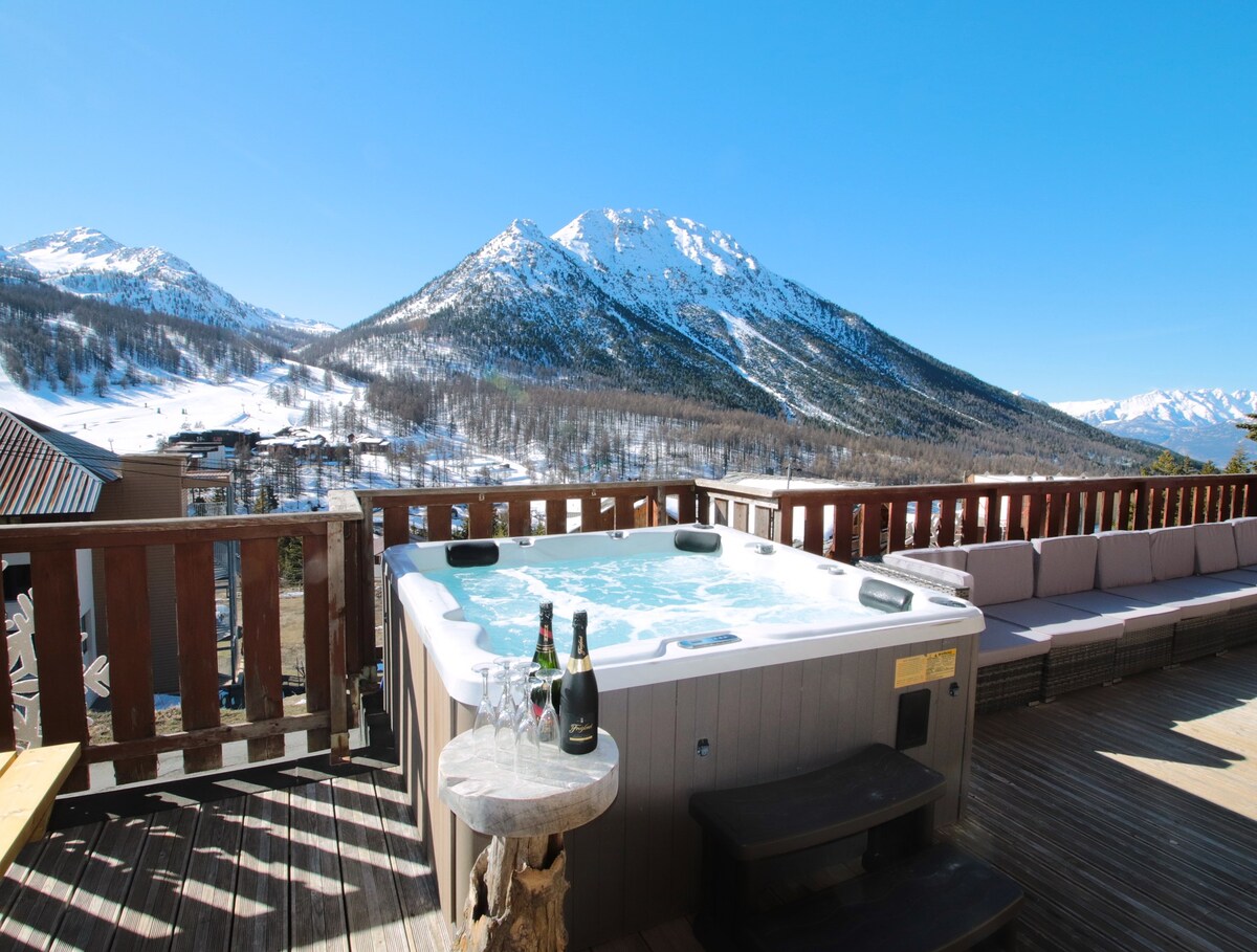 ブリアンソンの中心部に位置する豪華なシャレー。夏季には温水プール、電動天蓋付きテラス、ジャグジー、サウナをご利用いただけます。 4つのベッドルーム、広いリビングルーム、広いテラス、リラクゼーションネット、大きなアイランド(グリル、フライヤー、流し台)、ラウンジ、トイレを備えた家族向けの理想的なシャレー。ブリアンソンのゲレンデから800mの場所にあり、スキーには南向きの日当たりが最適です。ファイバーによる無料インターネット接続。クライミングウォール、小さなラウンジ、各種ゲーム、卓球台を備えたお子様エリア。
