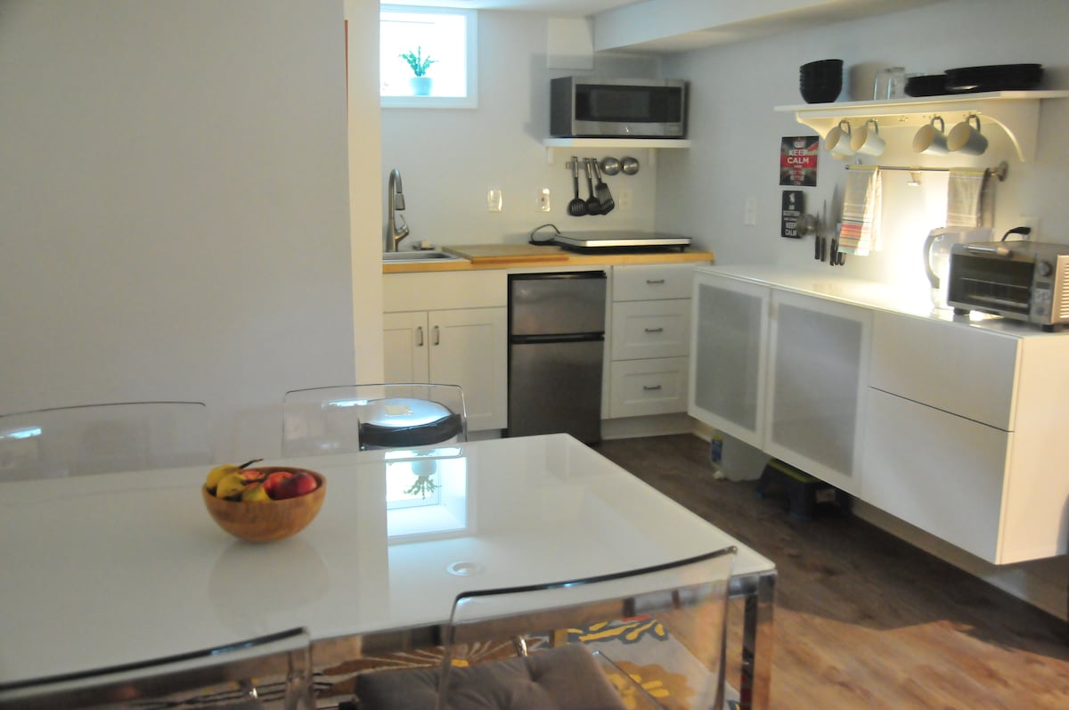 専用玄関がある、広々とした独立型の地下室スイートで、居心地のよいプライベートな滞在をお楽しみください。地下鉄まで約3キロ(1.9マイル)です! カップル、一人旅、または小さな家族連れの方々にぴったりのこの宿泊施設には、快適なクイーンベッドルーム、明るく広々としたリビングルーム(20フィート×10フィート)、ツインベッドになるソファ、そしてスタンドシャワー付きのフルバスルームが備わっています。コーヒーメーカー、電気ケトル、必要な器具がすべて揃った飲み物コーナーでコーヒーやお茶を楽しむ間、テレビ(RokuとYouTube TV)でさまざまな娯楽をお楽しみいただけます。