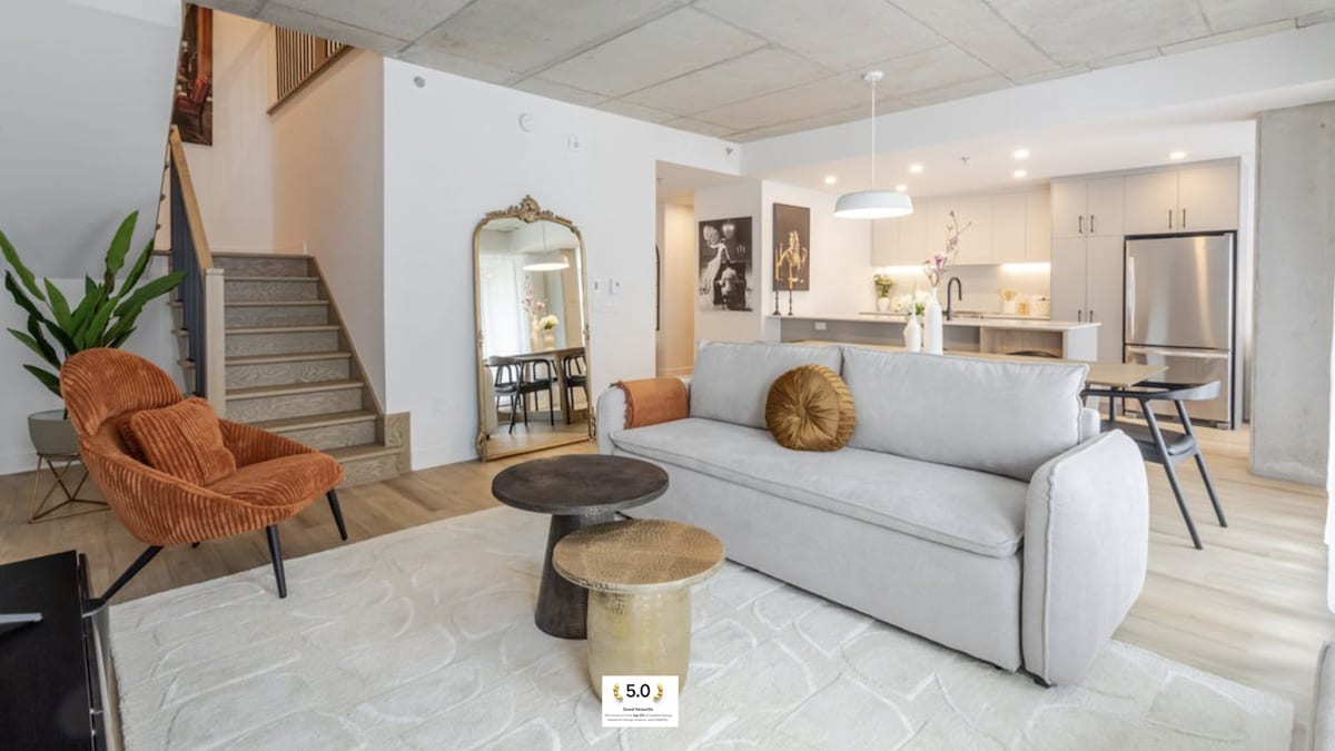 A large, bright, and spacious loft featuring a terrace designed to make the most of sunny summer days outdoors. This unique space is perfect for friends and families seeking a tranquil and high-quality stay in the heart of everything on the Plateau.