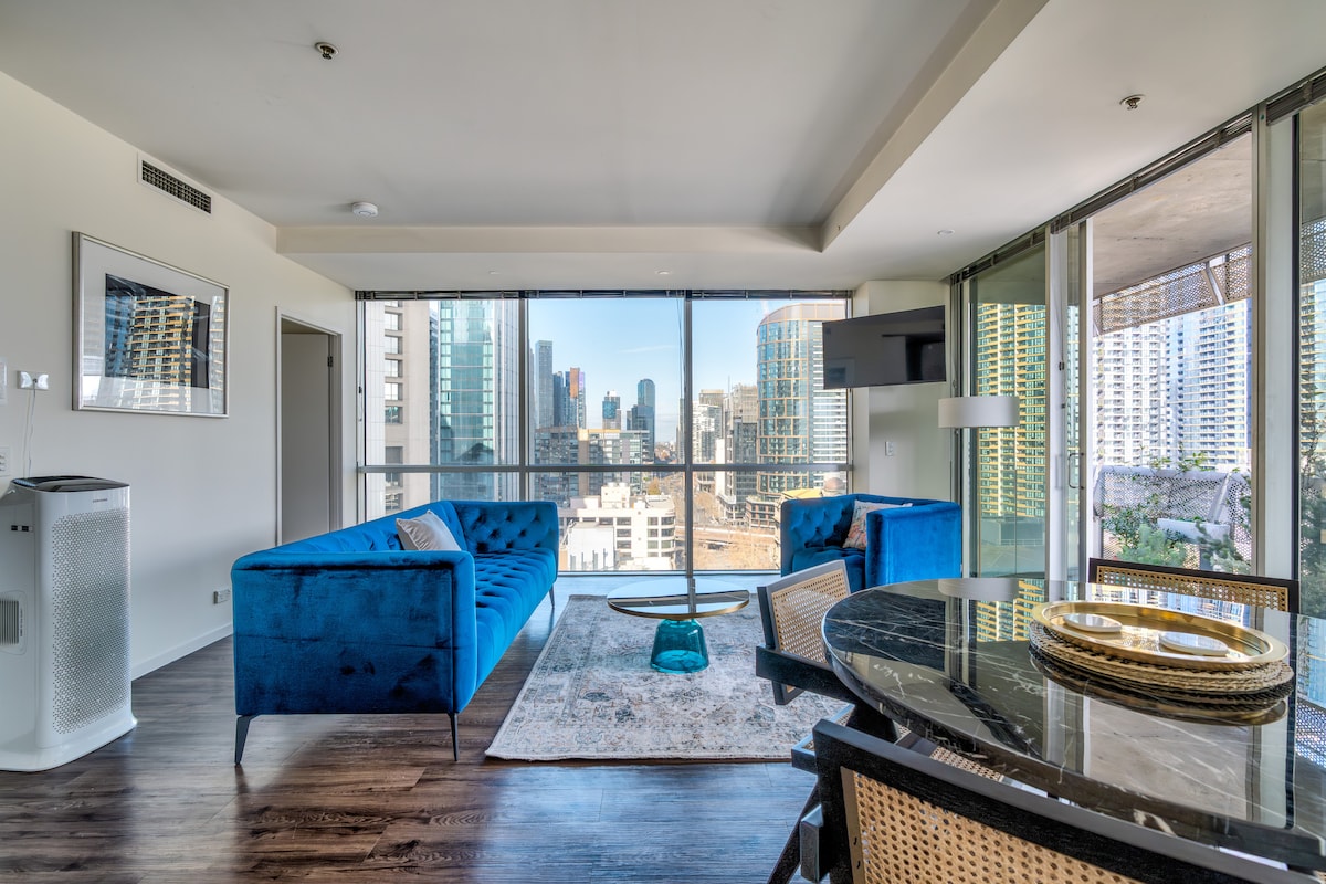 Welcome to my apartment with breathtaking city views. Nestled in the heart of Fitzroy Street, St Kilda, this urban oasis offers a comfortable stay for solo adventurers or couples. As you step inside you'll find everything you need from a well equiped kitchen and a living room with both a 2 seater and 3 seater couch and a 75inch TV. The master bedroom has a glass window wall allowing a dazzling city view from your bed. With its soft lighting and minimalist design, you will be well rested.