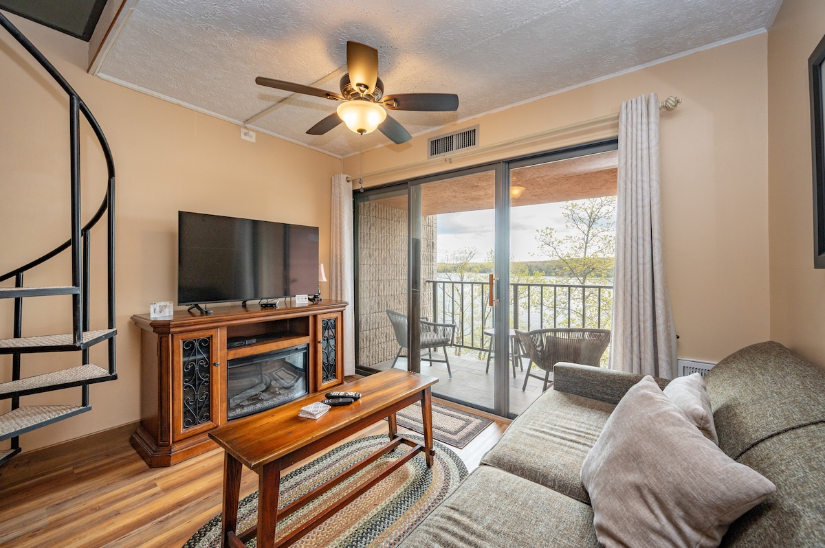 Lakefront studio loft, one-bath condo with private patio, full kitchen and electric fireplace. (Elevator access included) Hotel amenities available to all guests: Indoor pool and split-level whirlpool hot tub, two onsite dining locations, 240' of sandy beachfront and docks, fitness center, game room, racquetball court, covered parking, free WIFI, and a lakefront view with every room!