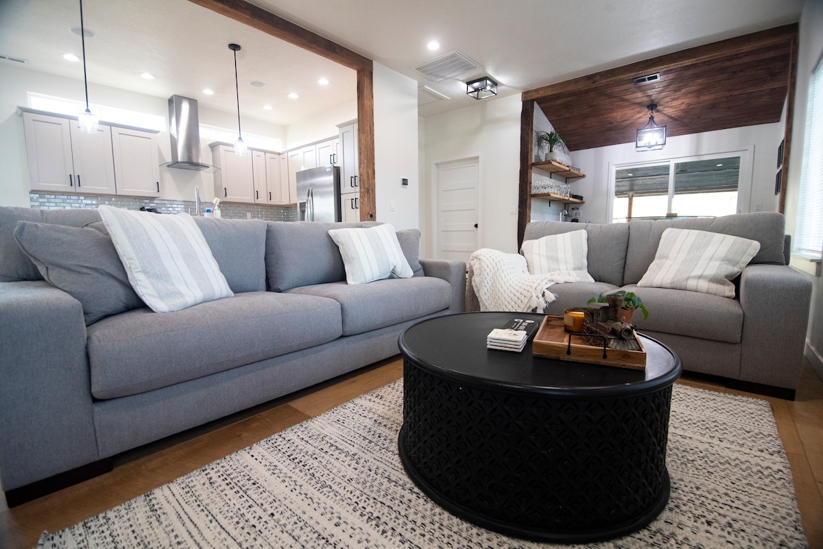 こちらはかわいくて便利な家で、寝室2部屋とフルバスルーム2つがあります。私たちは、この場所をピカピカに保つことに誇りを持っており、自宅のように感じられるように細部にまでこだわっています。新品の豪華なマットレス、巨大なメモリーフォームのビーンバッグ、快適なソファーが備わっており、出たくなくなるかもしれません。自転車、クーラー、犬小屋を備えたガレージは、滞在をより快適にするための特別な便利さを提供します