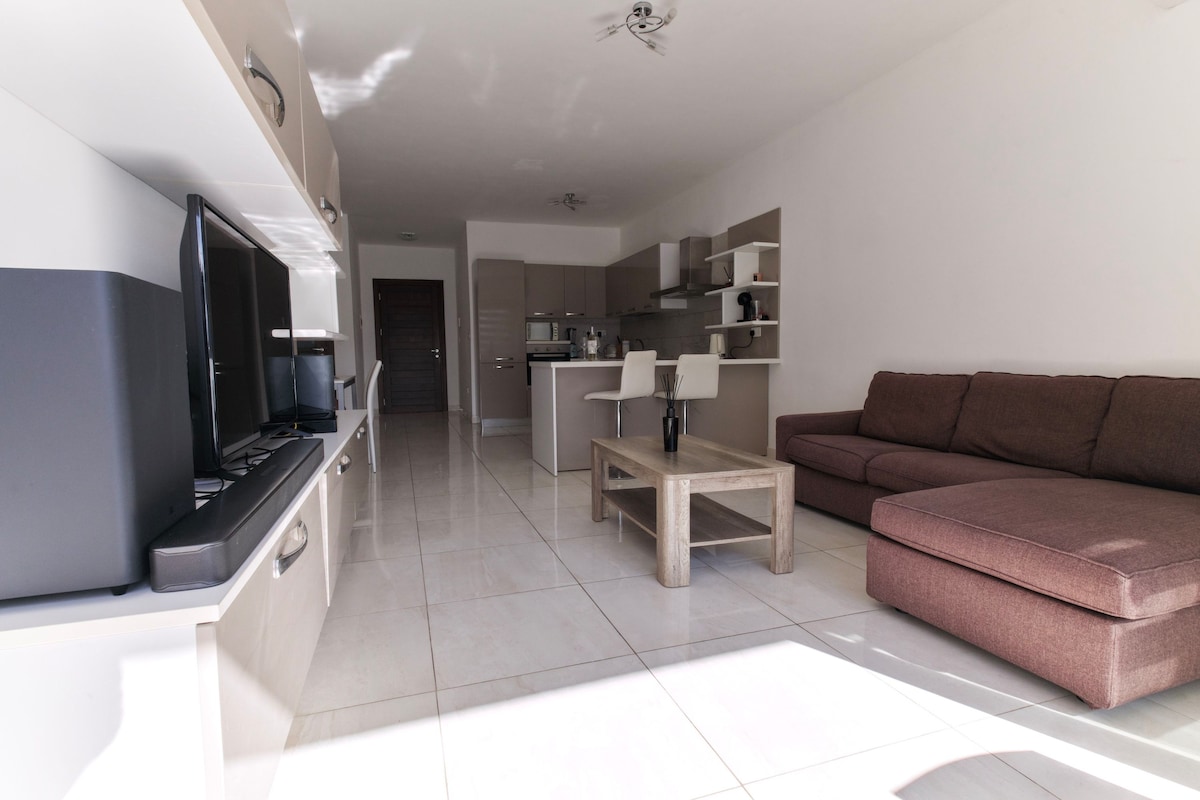 Orion Court Flat 4D , A nice romantic getaway to Malta. A stunning brand new one bedroom apartment, fully equipped. Fully air conditioning and washing machine. Fully equipped kitchen with dishwasher, microwave and coffee machine. A sensational living room with 50"Android Tv with access to multiple channels, streaming apps and wifi included. It has a lovely balcony with armchairs and a table.