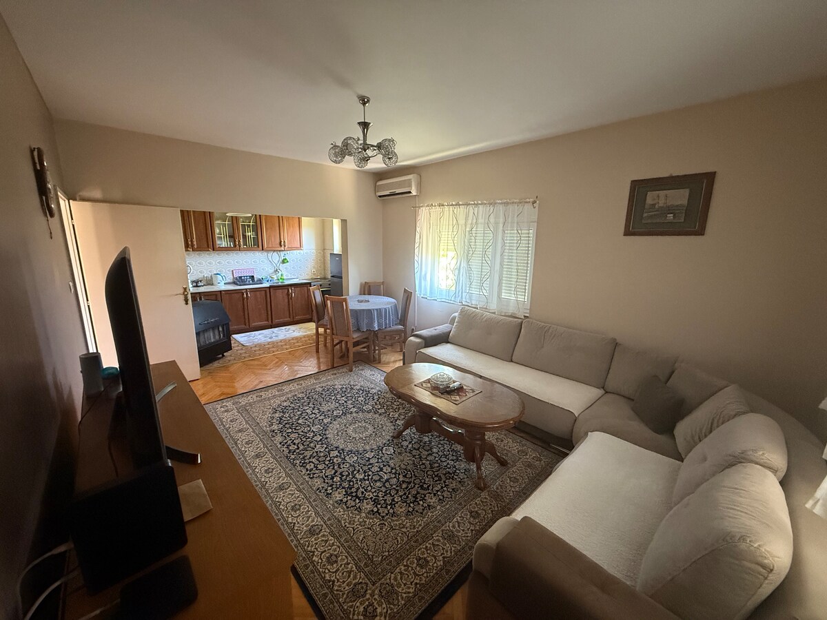 150平方メートルのとても素敵で居心地の良いオリエンタルアパートで、寝室が3部屋あり、山と川の景色を楽しめるバルコニーが2部屋あります。 美しい緑の庭もあります。 旧橋(パヴァロッティ音楽センターの近く)から徒歩わずか5分の場所に位置しています。 無料駐車場、洗濯機、食洗機、高速Wi-Fi、エアコン付きスペース、休息または仕事用スペース、バーベキュー用の暖炉がある広い庭があります。 宿泊施設は、モスタルの有名な音楽センターパバロッティの近くにあります。