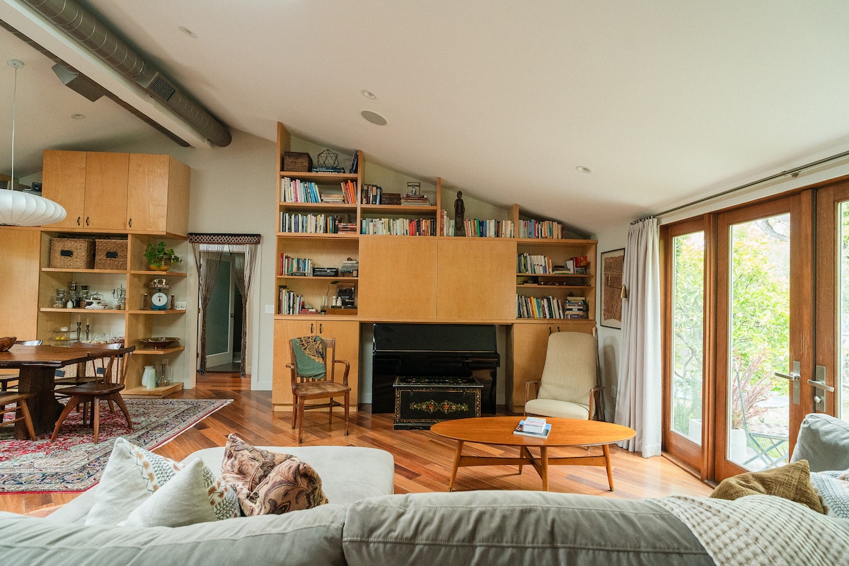 Midcentury modern 2bed/2bath stilt home with spectacular views above Sunset Strip (2 blocks up from Hollywood + Fairfax). Only blocks from the action, but very private and quiet. Recent renovations from roof to foundation, heat/AC system, 1 Giga/sec wifi, wired in + out with 11 speakers, movie projector + two 4k TVs (free Netflix, HBOMax and AppleTV+), 2-car parking with level 2 electric charger. Please note: No social gatherings or late, loud nights. Interior = 1015 sq ft. Deck = 300 sq ft.