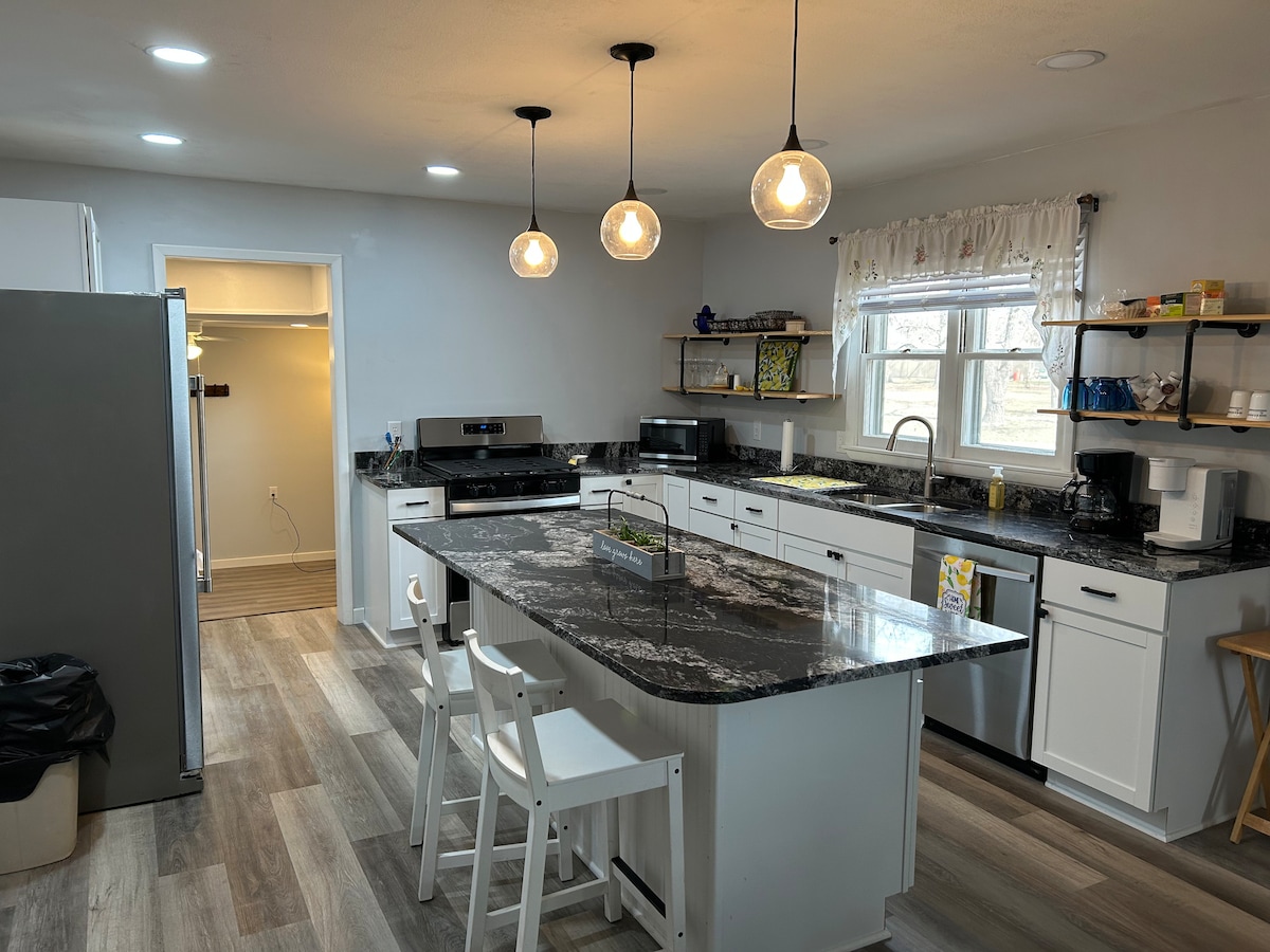 Escape to a secluded retreat on 40 acres! This 3,600 sq. ft. home offers 5 bedrooms, each with 2 queen beds, and 5 full bathrooms, perfect for families or groups. Relax in two cozy living areas, cook in the full kitchen, or enjoy stunning views from the large covered back porch. Just 5 min. from Cherryvale and 10 min. from Independence. Book your getaway today! PLEASE NOTE: No outfitters or large hunting groups without host permission. Cleaning or processing of animals is strictly prohibited.