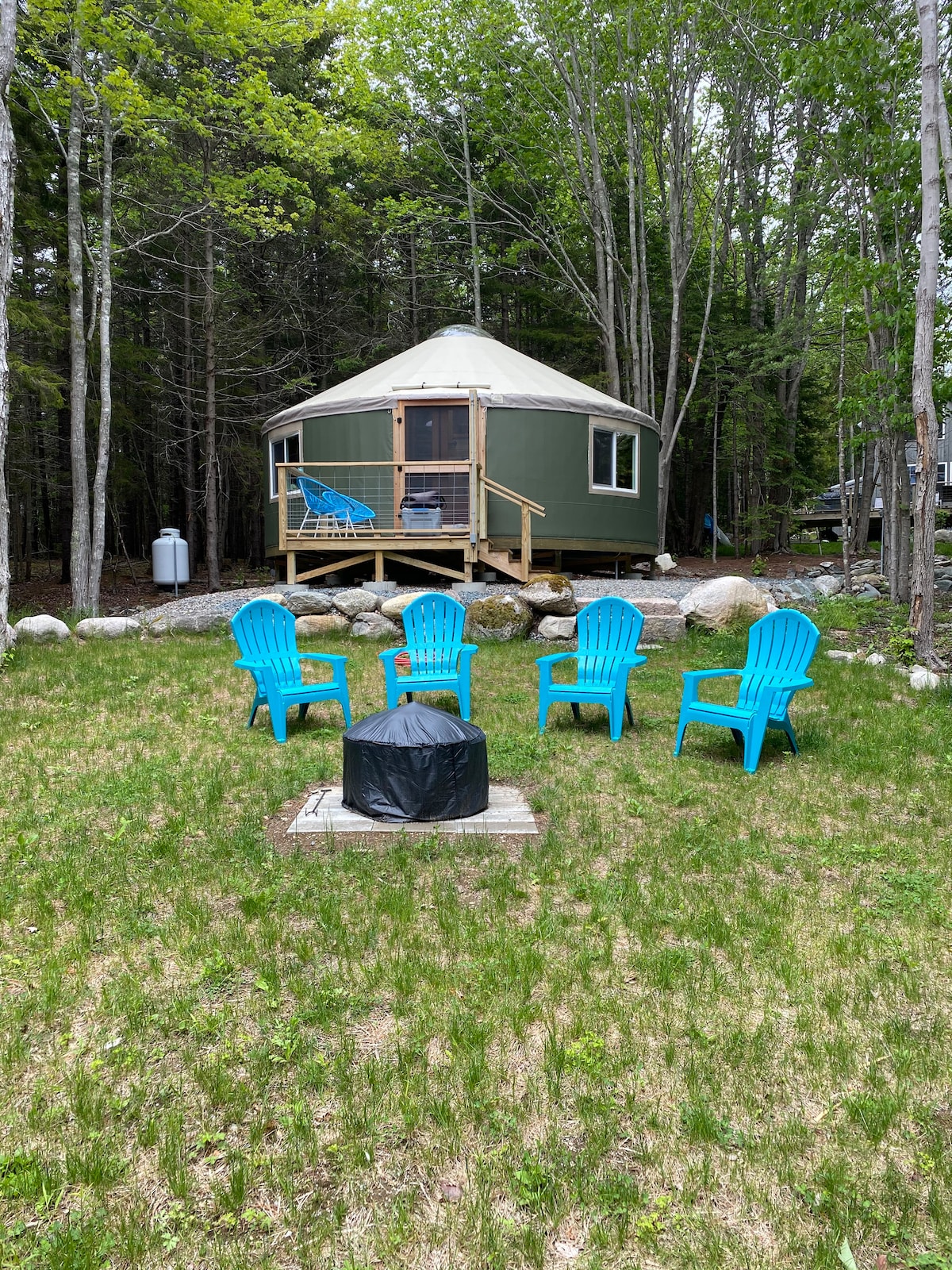 新築。オールドアコディア・レンジャー・ユルト、25フィート。 ロングポンドとアーカディア国立公園のハイキングコースから1/4マイルの松とカエデの森にあるユルト。 新築で、大きなウォークインシャワー付きのフルバス、ガスコンロ・オーブン、電子レンジ、冷蔵庫、ダイニングテーブルと椅子が備わったキッチンがあります。 寝具には、クイーンサイズベッド1台、折りたたみ式ダブルソファ1台、ロフトにクイーンベッド1台、折りたたみ式ベッド1台が含まれます。 タオルと寝具が用意されています。 4名様のみ(例外なし)。 ペットの同伴は許可されていません。