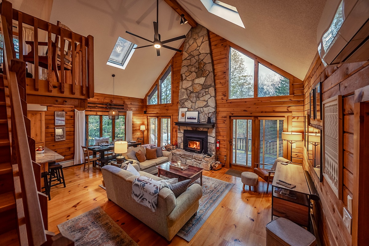 川と山の美しい景色を望む森の中にある、最近改装された輝くような清潔さのログハウスです。 ウィリアムズビルとニューフェインの魅力的な村の近くにあり、マウントスノーから12マイル、透き通ったロックリバーのすぐそばです。 ロマンチックな休暇、家族旅行、そして良い友人との充実した時間に最適な場所です。 山、川、そして上空の広い空の景色を楽しめる屋外のジャグジーもご利用いただけます。
