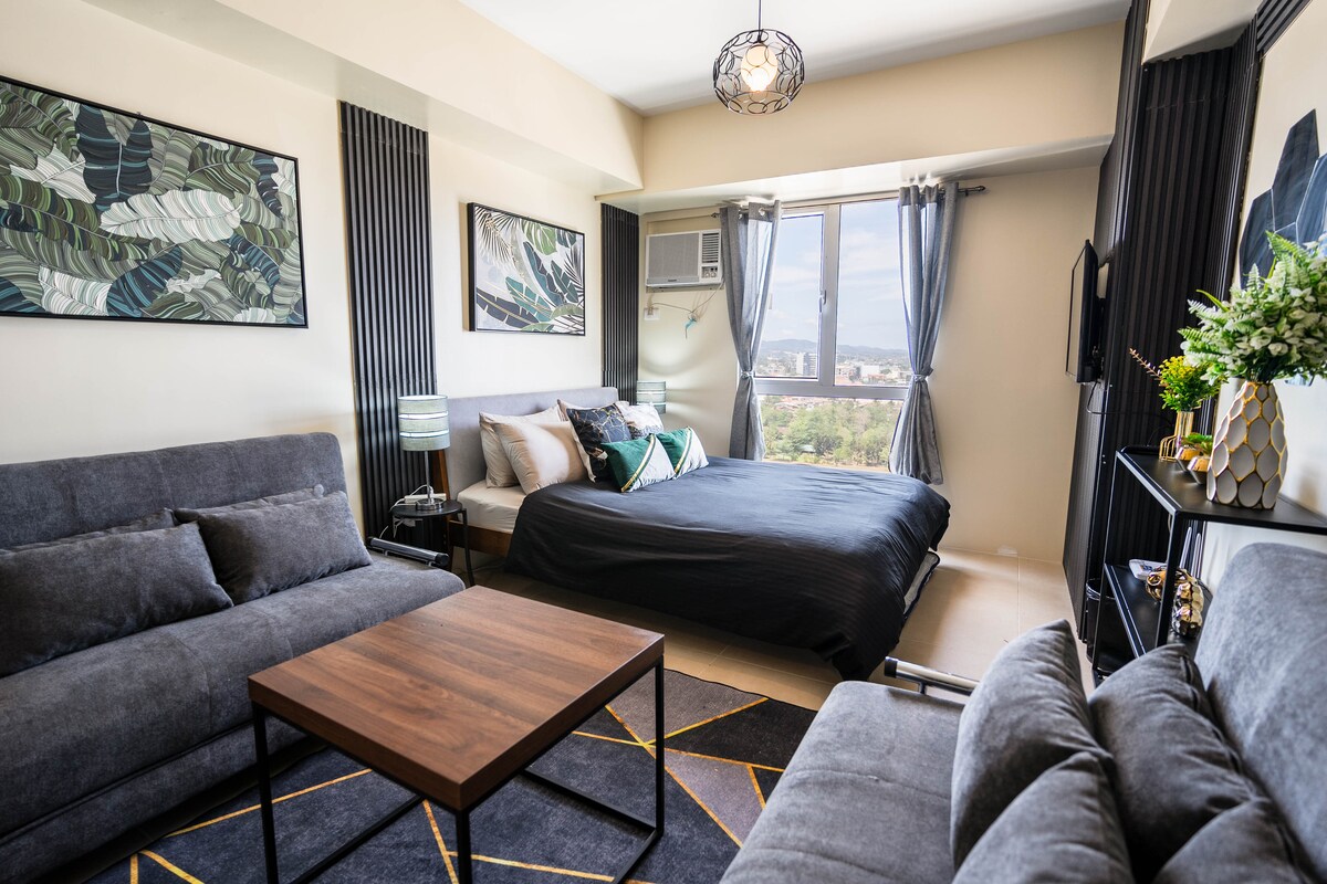 セブITパークの快適でスタイリッシュな宿泊先、The Amber Roomへようこそ! このフルエアコンのスタジオには、クイーンベッド、コンバーチブルソファベッド、高速Wi-Fi、Netflix、ワークデスク、遮光ブラインド、温水シャワー、洗濯機/乾燥機、冷蔵庫と電子レンジを備えた簡易キッチンがあります。 プールとジムをご利用いただけます。カフェ、コワーキングスペース、アヤラモールまで徒歩で行けます。ビジネスでも休暇でも、ゲストが何度も訪れたがるお部屋でリラックスしたり、充電したり、地元の人のようにセブを体験したりできます。
