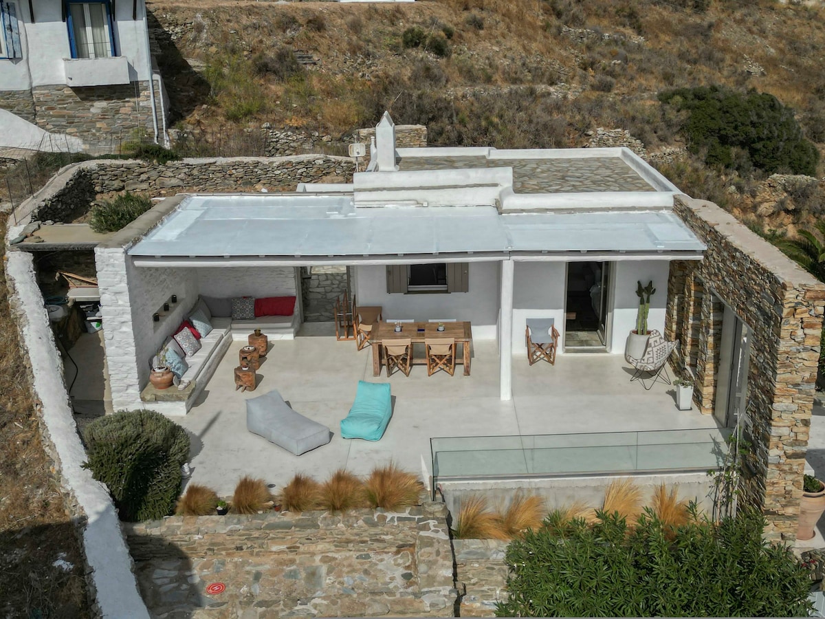 クティカドス村の端にある、ユニークに改装された伝統的なキクラデスの家に足を踏み入れましょう。 荷物を置いて、パティオにつながるダブルドアを開け、山と海の円形劇場の景色に落ち着きましょう! この宿泊施設は、屋外での食事、くつろぎ、比類のない夕日を眺めるのに理想的な一連のテラスで構成されています。 昼間は島特有のカラスが飛び回り、日が沈んだ後は月明かりに照らされた谷の羊が訪れます。