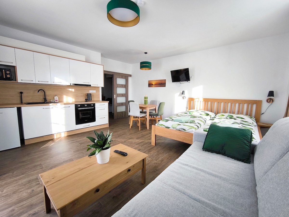 チェカノフ池の近くにある2〜4名用のアパートメント。アパートメントには、140cmのダブルベッド1台と、最大4人まで収容可能な折りたたみ式の布団があります。ただし、スタジオは小さいため、大人4人ではあまり快適ではないことにご注意ください。 ベッドリネン、タオル、シャワージェルなど、必要なものはすべて揃っています。コーヒー、紅茶、調理の基本的なものもあります。Wi-Fi、テレビ、洗濯機、冷蔵庫、冷凍庫、電気ケトル。アパートメントには、使用水(飲んだり吸ったりするためのもの)と十分な量のボトル入り飲料水があります。