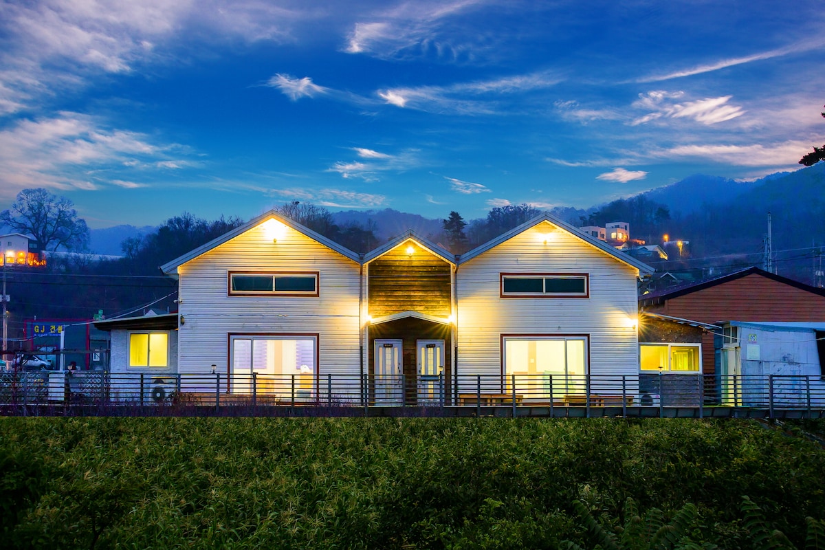 四季を自然と拝みながら休めることができる空間 ㆍ 広い芝生の庭があります 長冬台 遠くに高くそびえる田舎の家ㆍ 裏山の茂る柿の木の森〜春から石の隙間からチクチクと菊とコスモスが空を埋め尽くす場所〜 鳥のさえずりで目を覚ます場所です。庭でバーベキューを楽しみ、フォトゾーンがある白いウィンドウでお茶を飲み、ドーランドーランのミリンの花を咲かせることができます。 すぐ下に見える400メートルの距離には、最近のトレンドである2号倉庫カフェと広々とした素敵な杜ウンリカフェ(車で1分)があり、セングハンプが揃っています。3分の距離には有名なウサギ宇宙センターがあり、子供たちとの旅が癒しの場所です。 2階にも山を眺めながらお茶を飲める小さくて居心地の良い空間があります〜