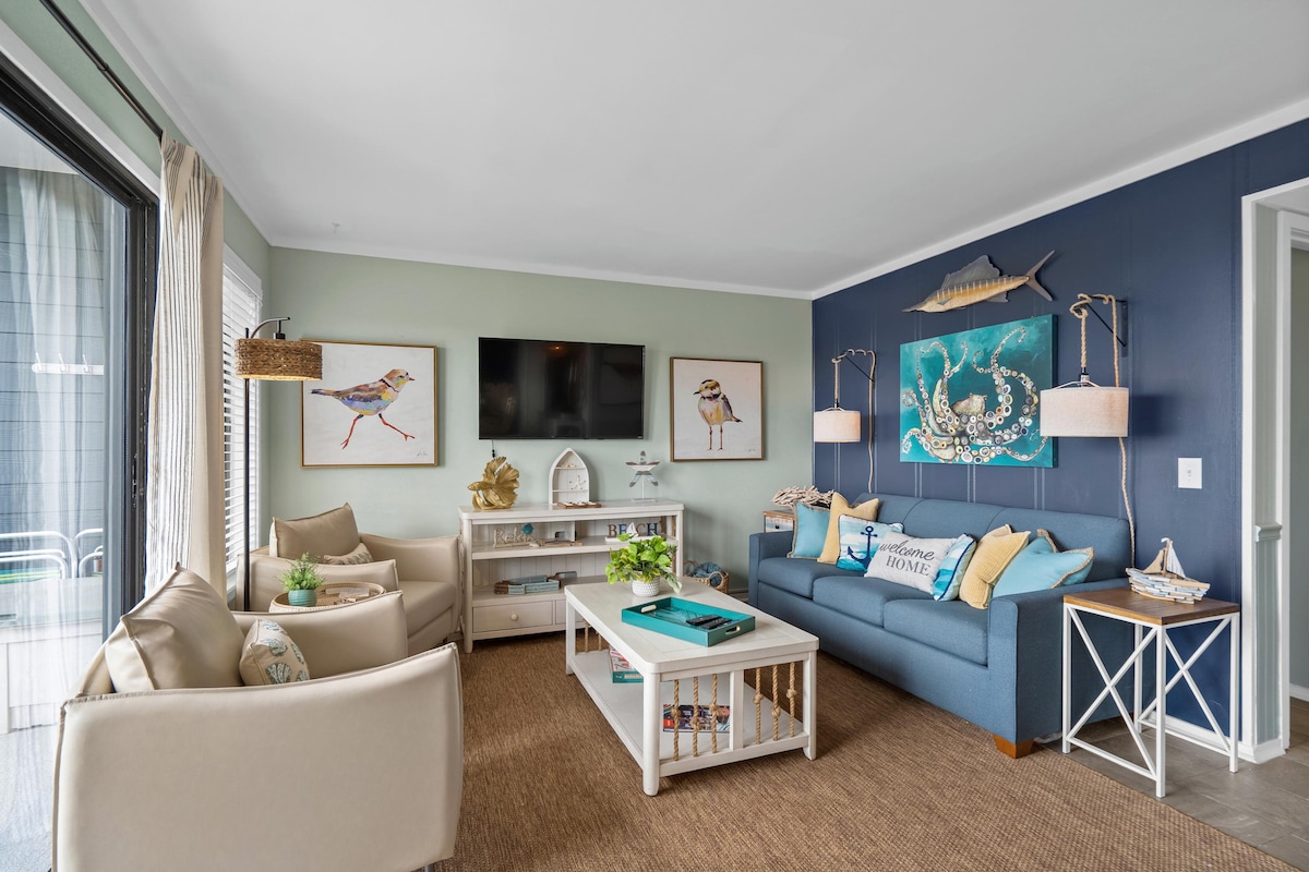 ゲート付きのサーフサイドビーチリゾートであるオーシャンサイドビレッジにある、このトップユニット3BR/2BAでリラックスしましょう。専用のビーチ駐車場があり、シャワーとトイレを備えたアクセスが可能です。内部:オープンリビングエリア、フルキッチン、スマートテレビ、ランドリーエリア、家族連れや少人数グループ向けの快適な寝室。コミュニティには、屋外プール2つ、屋内温水プール、キッズスプラッシュパッド、フィットネスセンター、テニス&バスケットボール、ボッチェ、釣り湖があります。サーフサイド&ガーデンシティピアまで数分。楽しくリラックスできる、手軽な海辺の拠点です。