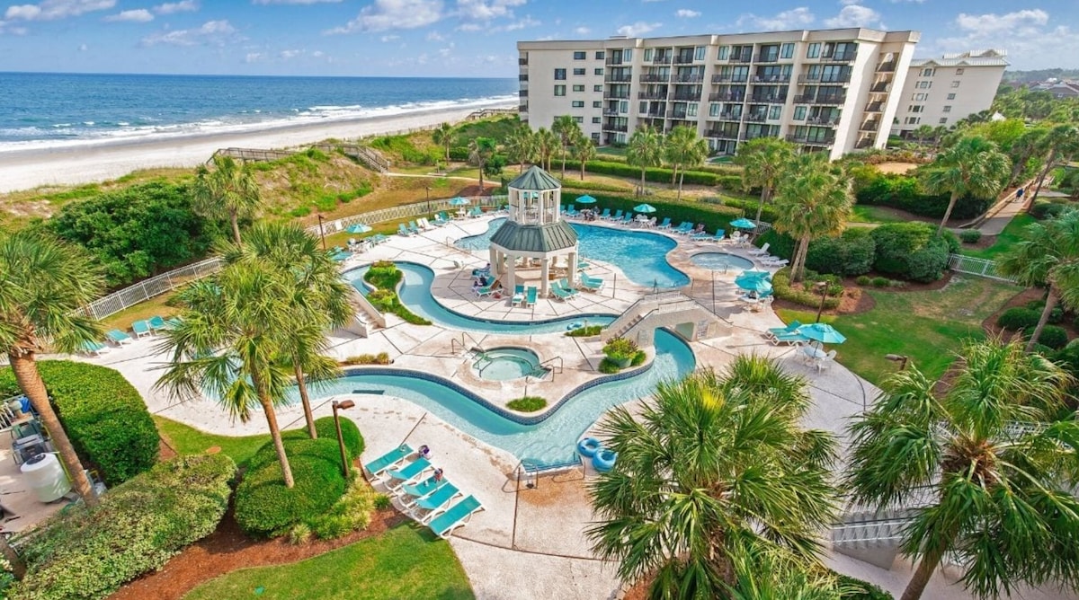 Simply SUNsational at Caravelle Resort is located along Myrtle Beach’s Golden Mile. This 11th-floor oceanfront unit features a king bed, Myrtle Beach views, a well-equipped kitchen, and a private balcony perfect for morning coffee or sunset drinks. Enjoy quiet beach time, the lazy river, pools, hot tubs, onsite dining, Tiki bar, fitness center, gift shop, free Wi-Fi, and free parking.