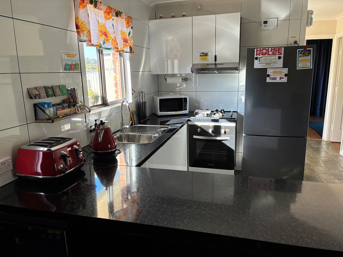 Once booked READ THE INSTANT MESSAGE FROM ME and reply. NEW: EV metered trickle charging now installed. This two-bedroom house has been refreshed inside making it a nice place to relax. Best part is being three streets away from the main street as its very quiet especially at night to sleep with no truck noise to bother you from the main highway.
