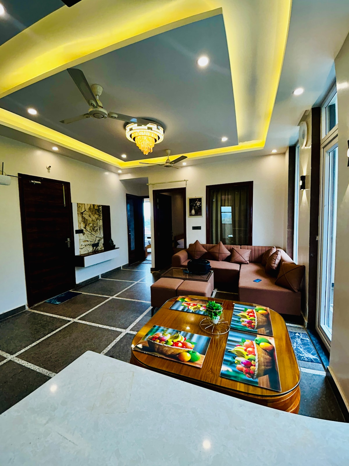 "Welcome to our tastefully curated homestay, where comfort meets style. Adorned with elegant panels, ambient studio lights, and a 55-inch TV, our space is designed for groups to unwind and relax peacefully. Please note, to ensure a peaceful environment for all guests, we kindly request lowering music by 10:30 PM, and we appreciate your understanding in refraining from loud noises thereafter.