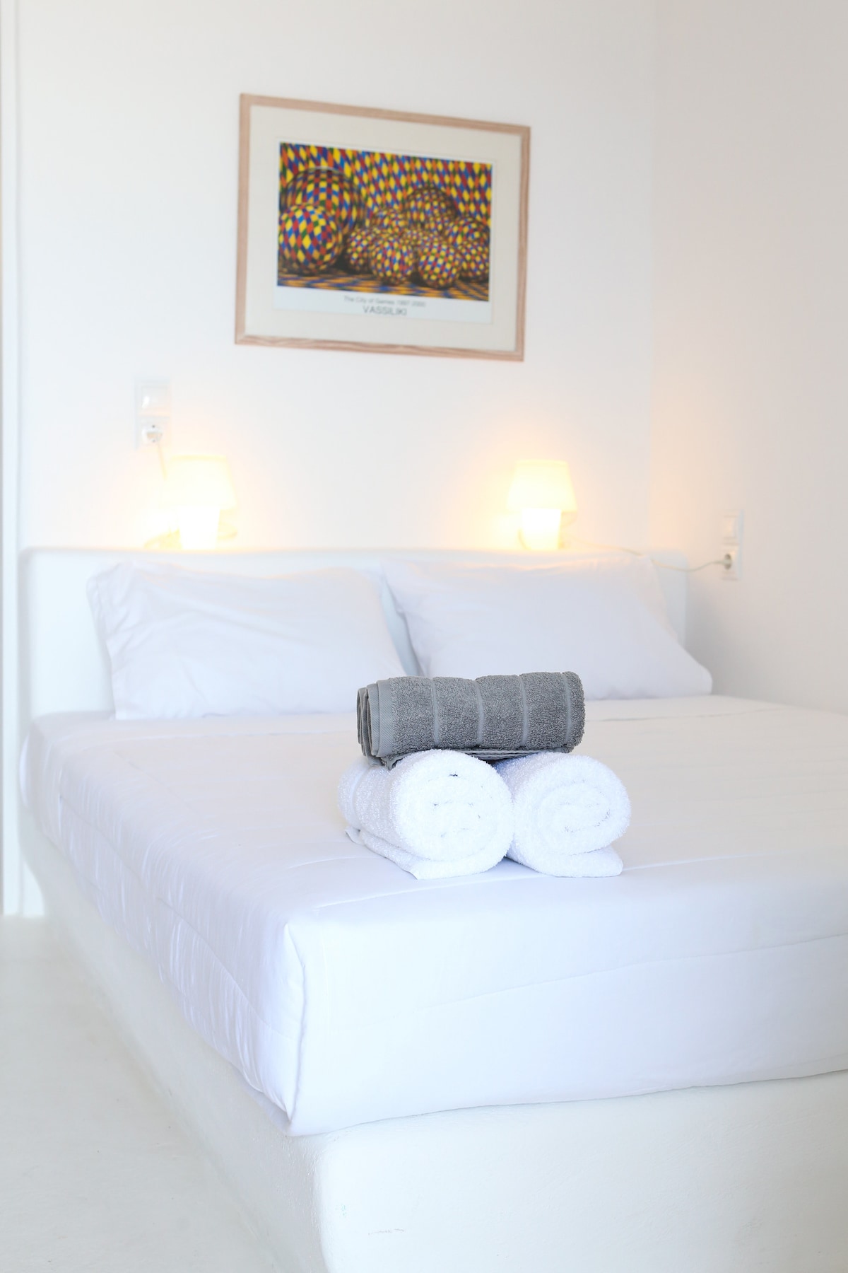 ミコノスの町の中心部にある3階建ての建物の中のお部屋です。各階に1部屋あり、このお部屋は3階にあり、専用バスルームとバルコニーがあります。町と海の景色が素晴らしいです。キッチンは1階にあり、共用です。Alexはいつでも近くにいて、お手伝いします