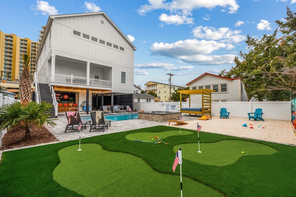 ノースマートルの6BR/6.5BAのラグジュアリーリゾート、AquaSandsに逃避行しましょう。ビーチから徒歩圏内にあり、大きな温水プールとスパがあり、18人が宿泊できます!4ホールのパッティンググリーン、ダーツ、シャッフルボード、フーズボール、エアホッケー、アーケードゲームを楽しみ、日が沈む頃にはティキバーでドリンクをお楽しみください。中に入ると、魅力的で開放的なリビングスペースと、みんなが集まるデザイナーズホームがあります。すべての階に専用エレベーターがあり、徒歩7分の場所にメインストリートのレストランやバーがあり、楽な休暇を過ごすことができます。