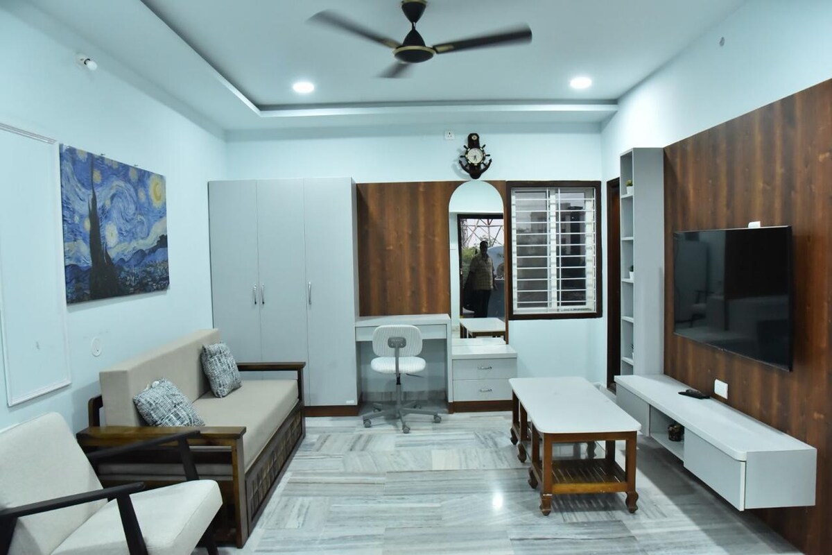 ● Independent ground-flr 1BHK in central Hyderabad,quiet, well-connected ● Bright living area, sofa & TV for relaxed stays ● Kitchenette with induction,fridge & light utensils for long stays ● Cozy Bedroom with bed,work desk & chair,ideal for WFH & exams ● Perfect for professionals,exam aspirants,remote workers ● Prime access:Charminar20min,Ramoji Film City45min,offices nearby ● Cafés,restaurants, supermarkets within walking distance ● Professionally co-hosted by The Homestay Academy