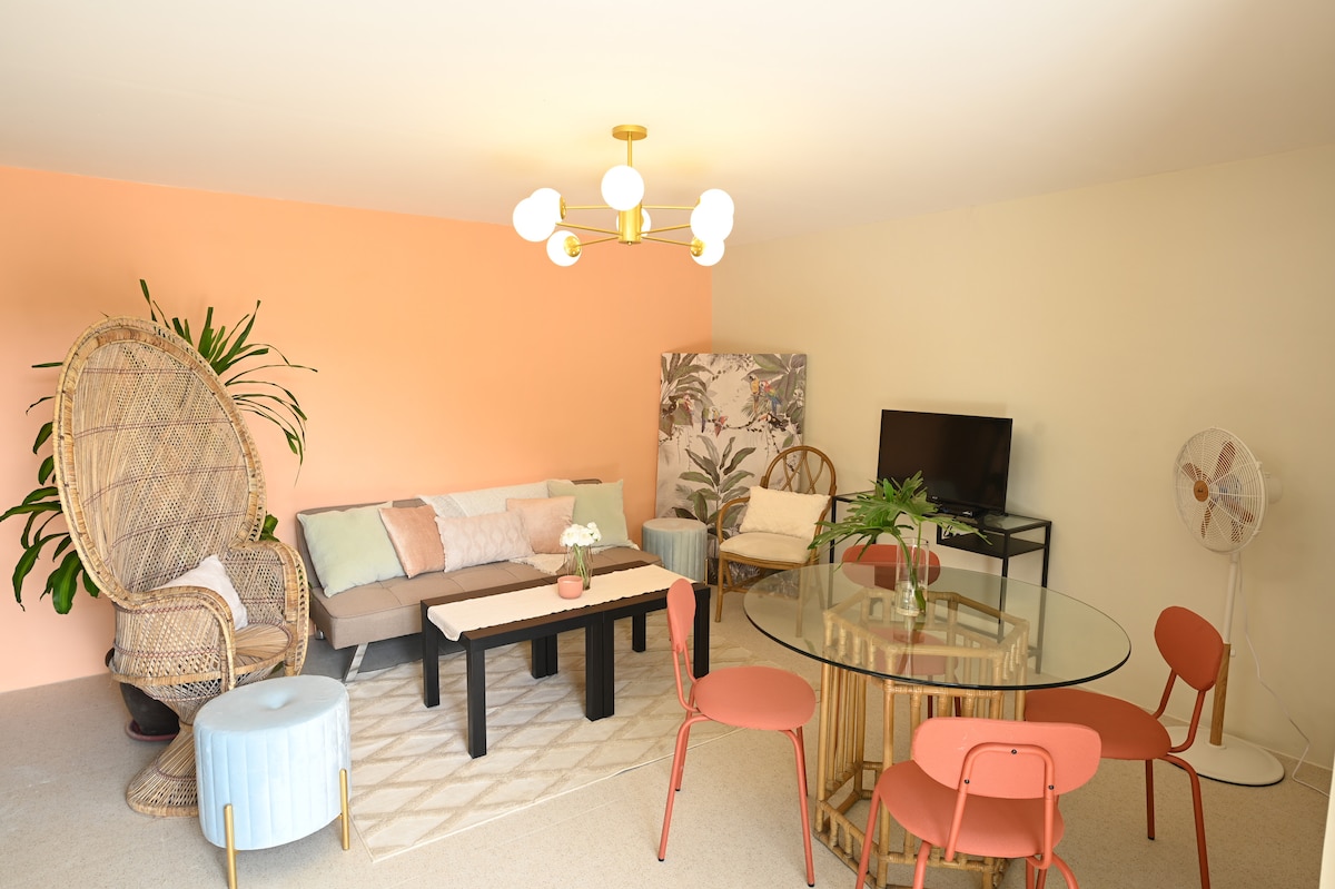 コートダジュールの心地よい魅力を家に取り入れました。 シンプルな白地に海岸の色を散らしたデザインに焦点を当て、お部屋全体に涼しく新鮮な雰囲気を与えています。 一息つく準備ができたら、ノーティカがゆったりとした雰囲気とタガイタイの涼しい風を提供し、元気を取り戻してくつろぐことができます。 最高の快適さをお届けするために、清潔なリネン類、毛布、枕カバー、タオル、シャンプー、石鹸はすべて揃えております。