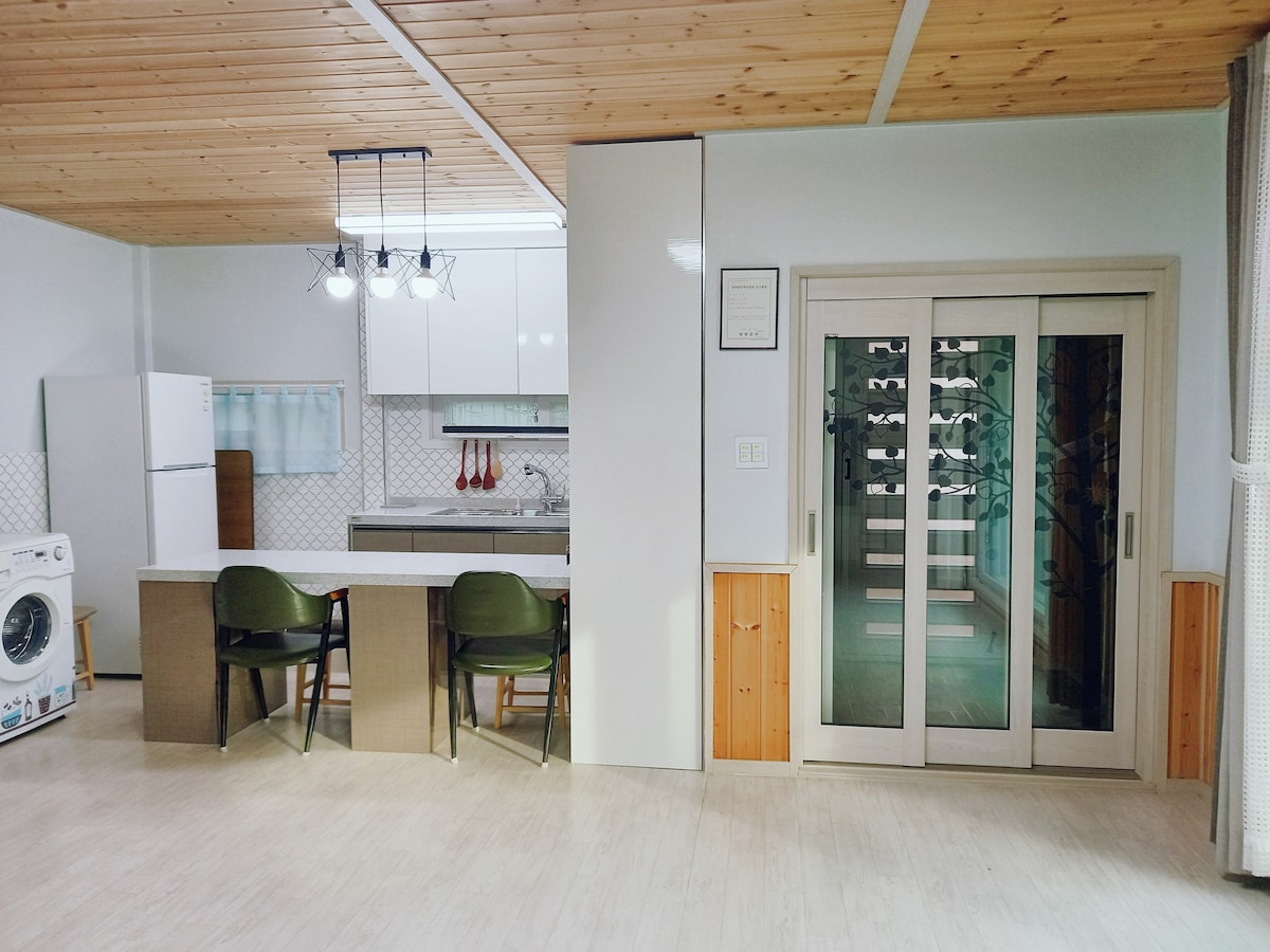 éããªç°èã®æã«æ°ç¯ããã2é建ãŠã®å®¶ã§ãã 1éã«ã¯äž¡èŠªãäœãã§ããã2éã«ã¯è€å±€åã®ç¬èº«è çšã®å®¿æ³æœèšãéå¶ããŠããŸãã å€éšé段ããå®¿æ³æœèšã«åºå ¥ãã§ãããããé察é¢ã§ãã§ãã¯ã€ã³ã§ããããŒããã¥ãŒãšãªã¢ãåºãæ°Žéããã©ã¹ãªã©ãèªç±ã«ãå©çšããã ããŸãã 䞡芪ãåžžé§ããŠããã®ã§ãäžäŸ¿ãªç¹ããªã¯ãšã¹ããªã©ã«ããã«å¯Ÿå¿ã§ããŸãã ç°èã§ãããåšèŸºã®ã¬ã¹ãã©ã³ãã«ãã§ãã³ã³ããã芳å å°ãŸã§ã¯è»ã§20å以å ã«ç§»åã§ããŸããïŒæèæµ·æ°ŽæµŽå Ž15åãã ã«ãæµ·æ°ŽæµŽå Ž6åããããããŒã6åãæèã€ããŒã15åãéªå²³å±±ã±ãŒãã«ã«ãŒ15åã駱山寺10åãªã©ïŒ ããŒããã¥ãŒãéã䜿çšããå Žåã¯ãè¿œå æé30,000ãŠã©ã³ã§ãã çãèªãããŒããéæ¿ãªã©ããã¹ãŠæã£ãŠããã®ã§ãé£ã¹ç©ã ããæåããŠãã ããã ãã©ã¹ã«ãããŒãã«ãçšæãããŠãããç°¡åã«é£äºãããæ¹ã¯ããŒããŒãã°ãªãã«ããå©çšããã ããŸãã 1éã®ã¹ããŒããã¬ãã2éã®ããããŒã ãããžã§ã¯ã¿ãŒã«ã¯ãNetflixãTvingãèªåãã°ã€ã³ãå¯èœã§ãã