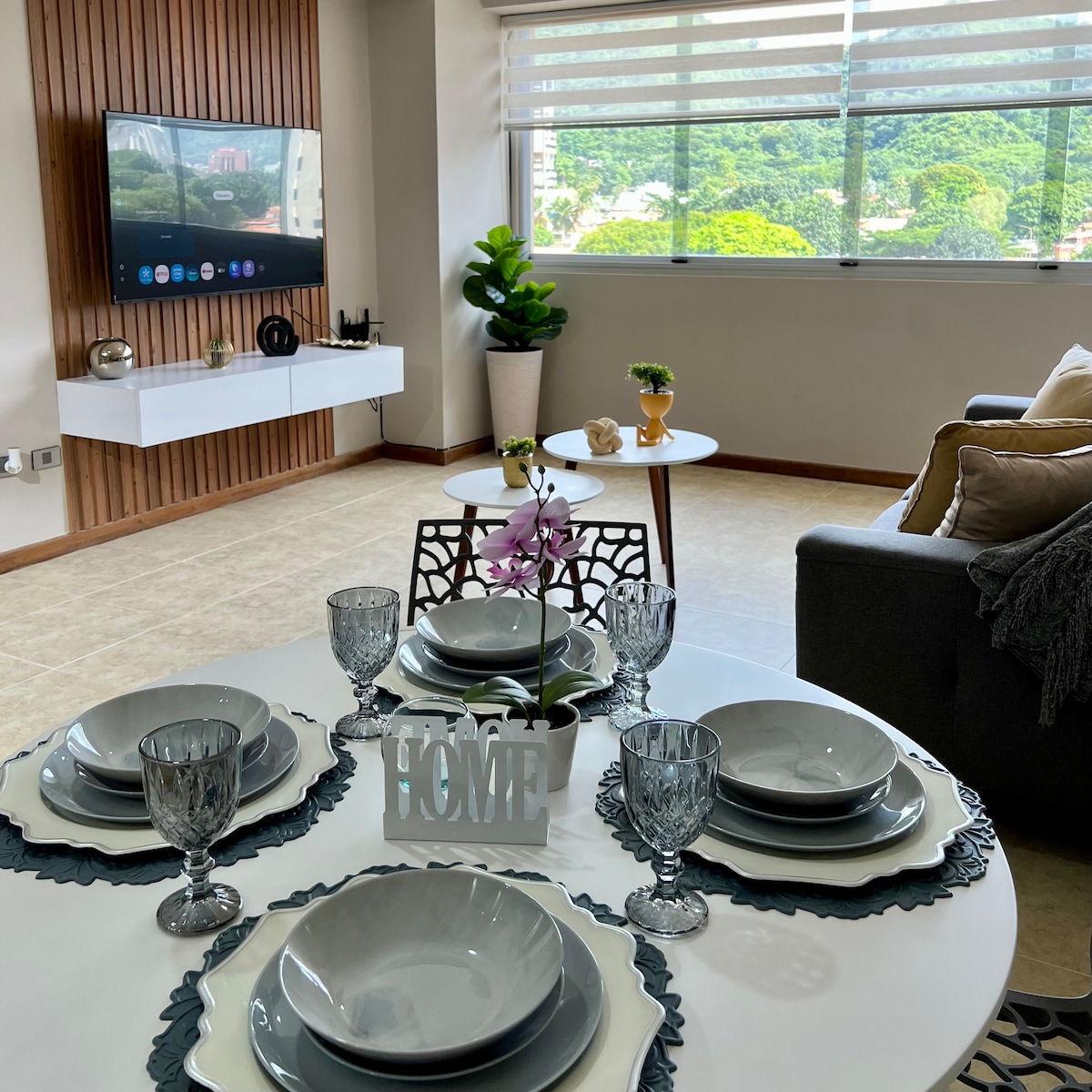 Disfruta de una estadía tranquila y acogedora junto a tu familia en este espacio diseñado para el descanso. Un lugar cómodo, funcional y con detalles pensados para que te sientas como en casa desde el primer momento. El alojamiento cuenta con una sala amplia y confortable, equipada con un sofá cama y un Smart TV de 50”, ideal para tardes de películas o series. A un costado encontrarás un comedor acogedor, con una hermosa vista a la ciudad, que se conecta perfectamente con la cocina.