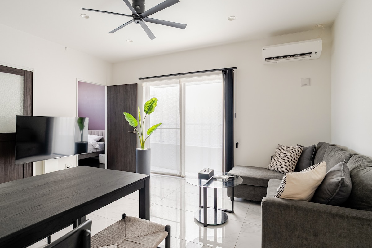 築3年、那覇市中心部にあり敷地内駐車場(1台)込みのコンドミニアム。 ※お車は軽自動車からコンパクトカーのサイズまで。 徒歩圏には、モノレール美栄橋駅(徒歩7分)、コンビニ(徒歩数秒)、24時間スーパー(徒歩10分)、国際通り(徒歩12分)や地元の飲食店などが多くございます。国道58号線まで徒歩数分ですが、夜は比較的静かなエリアです。 お部屋をまるまる貸切。サイズは約46平米で2ベッドルーム(ダブルベッド1台140-200cm、セミダブルベッド×2台、120-200cm)、リビング、キッチン、浴室をご利用いただけます。お部屋に階数指定は不可。 無料Wi-Fiを提供しており、スピードテストは50Mbps(2025年1月時点)。テレワークとしてもご利用いただけます。 簡易キッチンツールや、洗濯機、乾燥機もございますので長期滞在にも最適。備品等も用意しておりますが、ご使用後は各自でご購入していただきます。設備や備品等の詳細は、リスティング内「お部屋」か写真をご確認ください。 駐車場サイズはコンパクトカーまで駐車可能です。