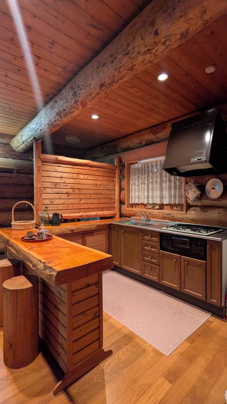 スタイリッシュなこのログハウスは、自然の恵みがあふれる飯綱高原(長野県)の標高1,300メートルに位置しています。カップルやご家族、または小さなグループに最適な隠れ家で、薪ストーブ、TV、ブルーレイ/DVD プレーヤー、ステレオ、革張りの椅子、設備の整ったキッチンが備わっています。近隣でハイキング、スキー、バーベキュー、ゴルフ、温泉などをお楽しみいただけます。JR北陸新幹線及びしなの鉄道 長野駅から車で約20分です。