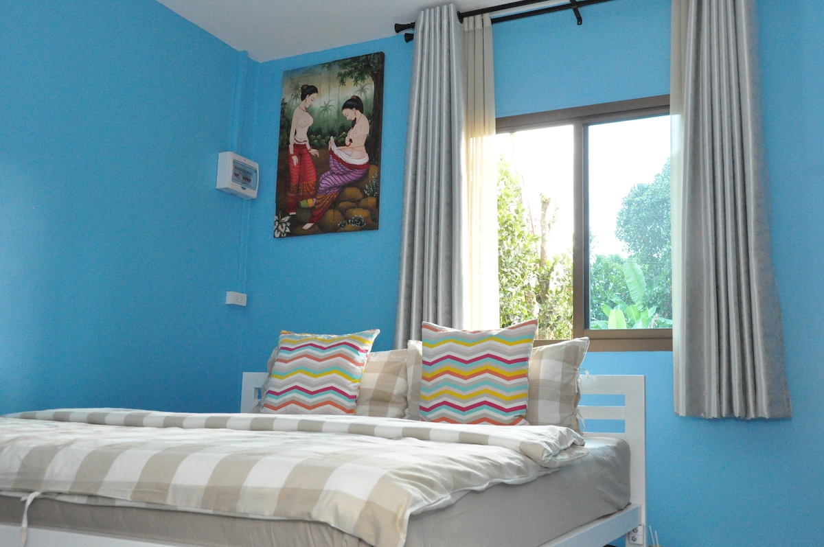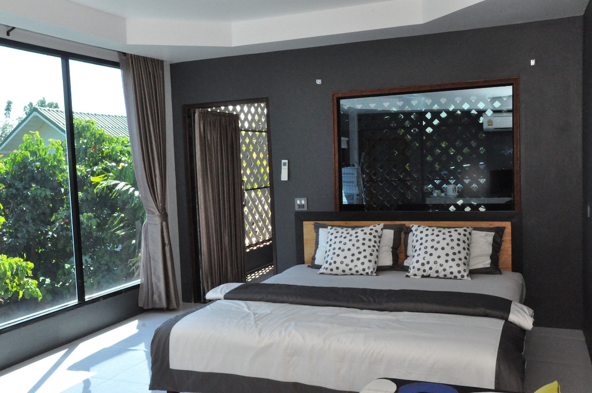 私の家「Binlar Home」は、滝や果物で有名なナコンナヨク県サリカにあります。 Binlar Homeには屋上があり、カオヤイ山脈の壮大な景色を眺めることができます。 1階には充実したバー、果樹やハーブ、野菜があるオーガニックガーデン、毎日のハウスキーピングができる6つの客室があります。 私は4匹の犬と一緒に裏庭の部屋に住んでいます。タイの地元の家での暮らしを体験させていただきますが、ホテルの客室のような快適さをお楽しみいただけます。