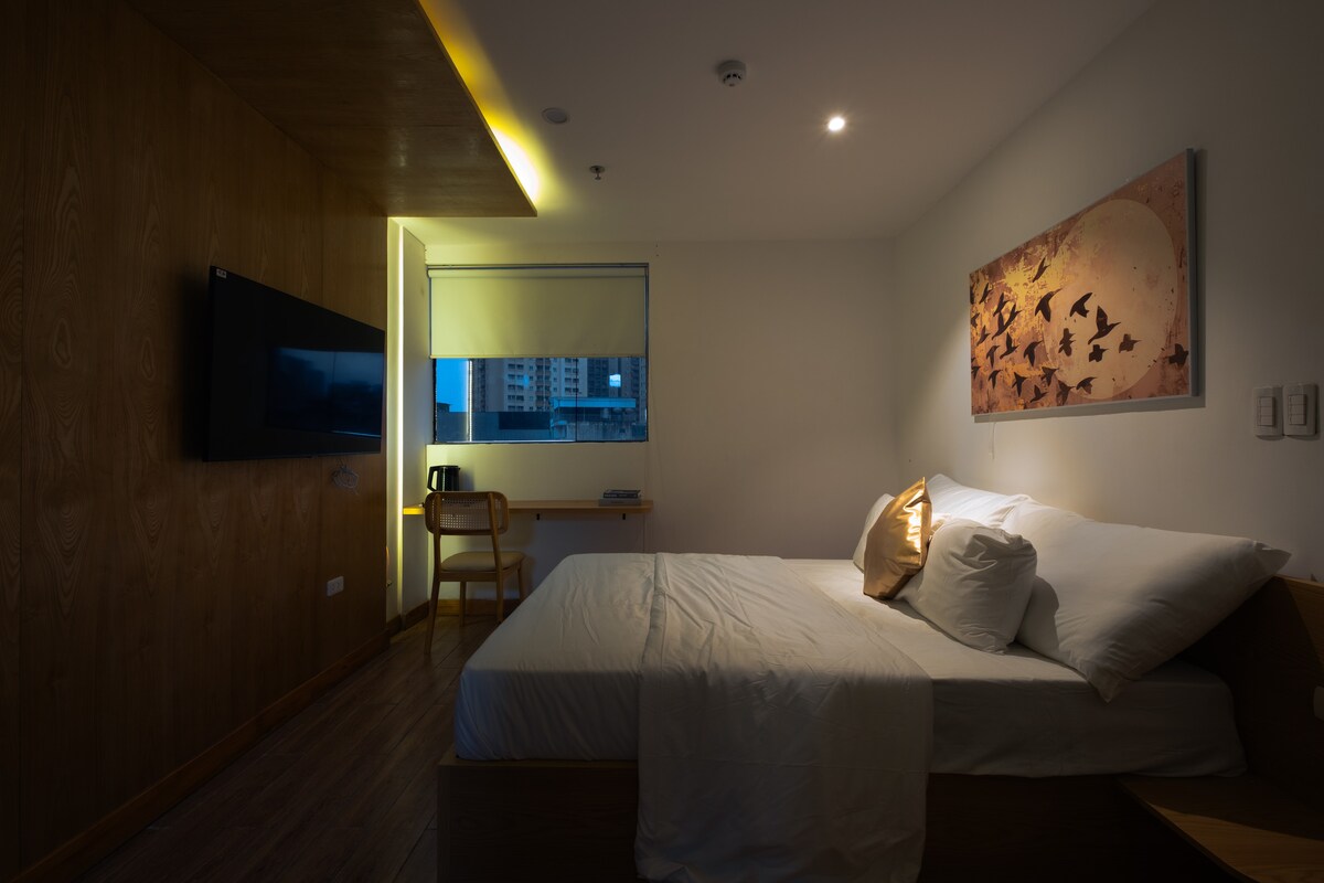 A89ロザリアンホテルのデラックスダブルルームは、ミーディン地区に位置し、ミーディンスタジアムに面した大きな窓があり、開放的な景色と自然光がたっぷりあります。客室には広々としたダブルベッド、モダンな家具、高速Wi-Fi、テレビ、ミニバー、清潔な専用バスルームがあります。ミーディンスタジアム、ケアンナムランドマーク72、コンベンションセンターへの移動に便利なロケーションです。出張やイベントに参加するお客様に適しています。