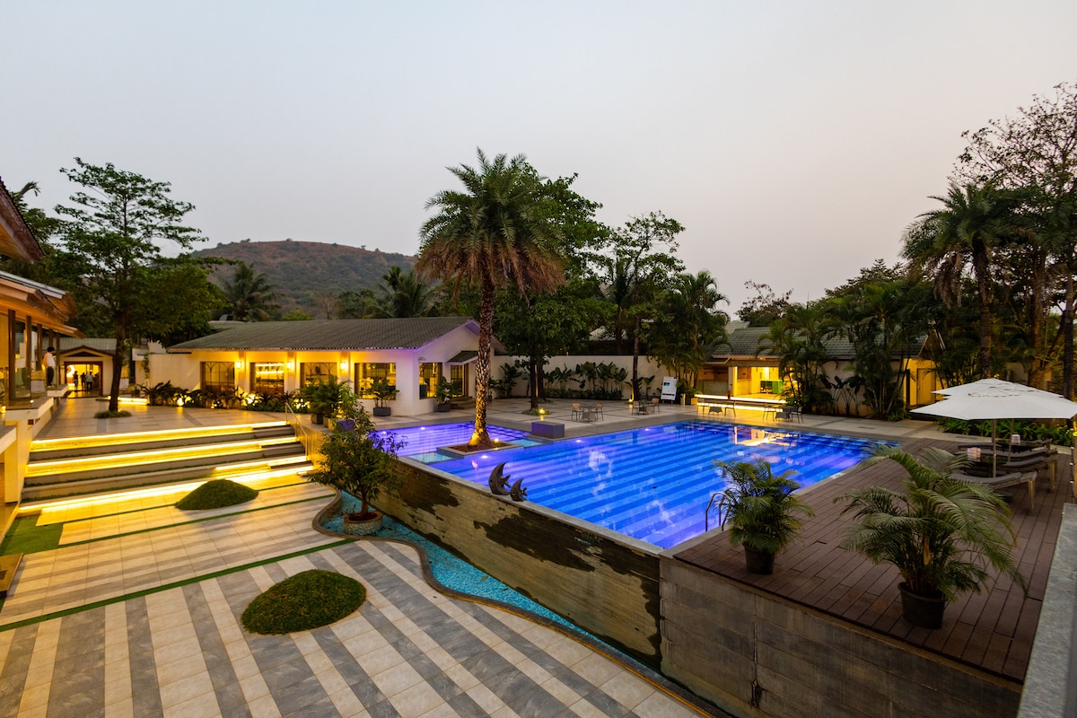 4ベッドルームのStayVista@Casa Del Verde、プール、芝生、焚き火