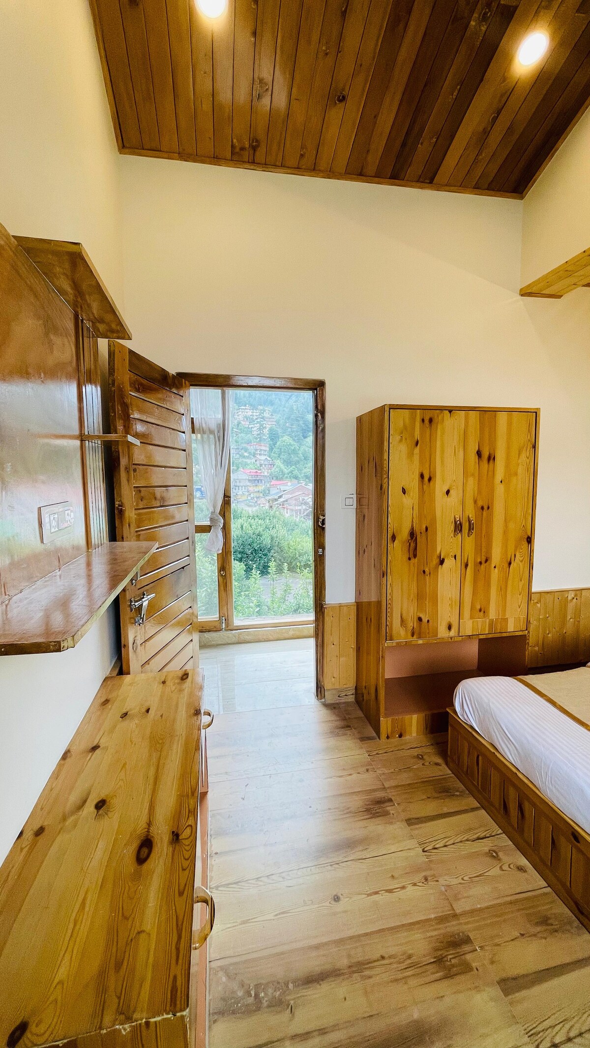 farm-stay is perfect for travelers seeking quiet, beauty, and authentic mountain living. Set in a picturesque location, the studio offers spectacular valley and mountain views, with the soothing sound of birds and the gentle roar of the Beas River creating a truly calming atmosphere. The fully equipped studio is designed for comfort and simplicity. It features a cozy double bed, wooden flooring, a study table, a clean modern bathroom, and a complete kitchen for self-cooking.