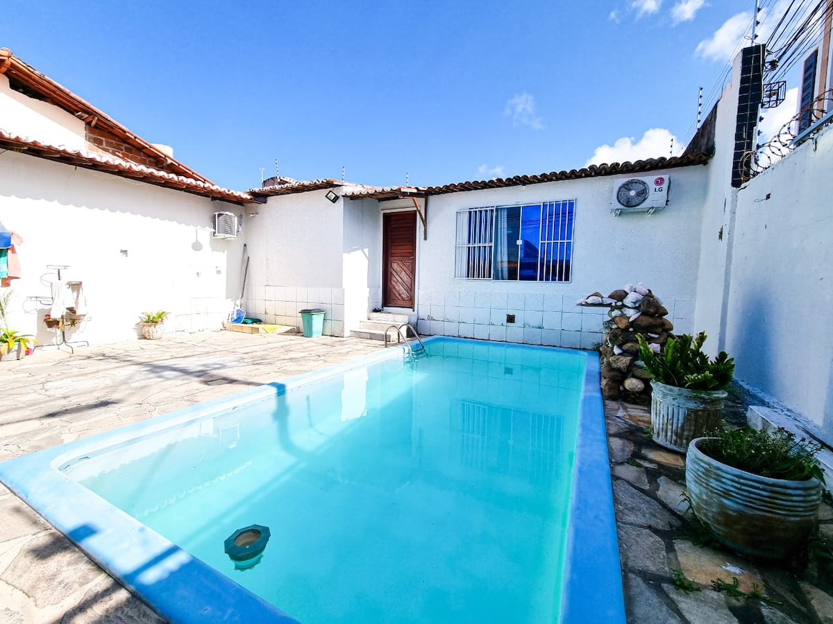 Casa bem aconchegante. Sala: Com ar condicionado, TV de 70'', sofá cama e rede. Cozinha: completa no ambiente. Quarto 1: possui ar condicionado e cama king size na suíte, além de 2 guarda-roupas e mesa de trabalho, e outra TV de 60 polegadas. Ante quarto: Também possui um outro quarto ligado ao primeiro com outra cama de casal. Ao todo a casa disponibiliza de 1 banheiro e 1 lavabo. Tem ainda 1 vaga de garagem, piscina, churrasqueira e área externa com chuveiro.