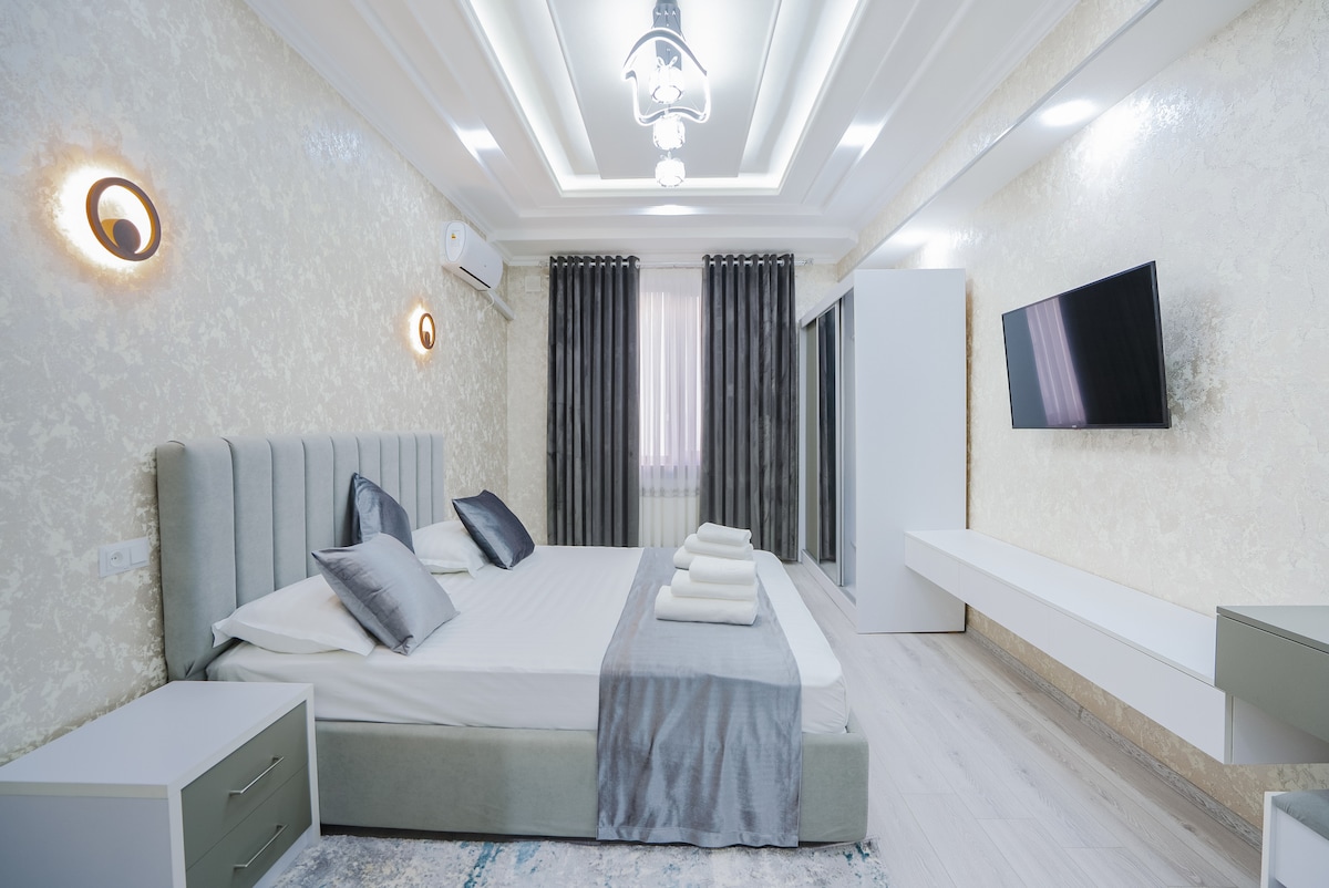 ブハラモールからわずか数歩の街の中心部にある、モダンで広々とした87 m²のアパートをお楽しみください。アパートには、キングサイズのベッド1台とシングルベッド2台を備えた明るい客室が2部屋あり、家族やグループに最適です。すべての調理器具、大型冷蔵庫を備えた設備の整ったキッチンで自宅で料理を楽しみ、無料Wi-Fiとテレビをお楽しみください。賑やかなエリアにあり、お店やカフェなど、快適で便利な滞在に必要なものがすべて近くにあります。