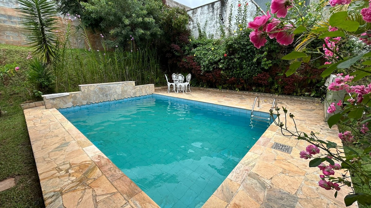 Lugar muito aconchegante, perfeito para descansar em meio da natureza. Horários de Check in e check out super flexíveis, consulte . Jardins encantadores lago com quiosque a 100 metros da casa .Linda e grande piscina com hidromassagem e cascata . Dois Salões para churrascos um deles com jogos, mesa e cozinha na área da piscina . Com muito verde em toda a sua extensão. Destino ideal para férias, feriados e finais de semana. Animais exóticos. Descontos especiais para 3 noites ou mais consulte .