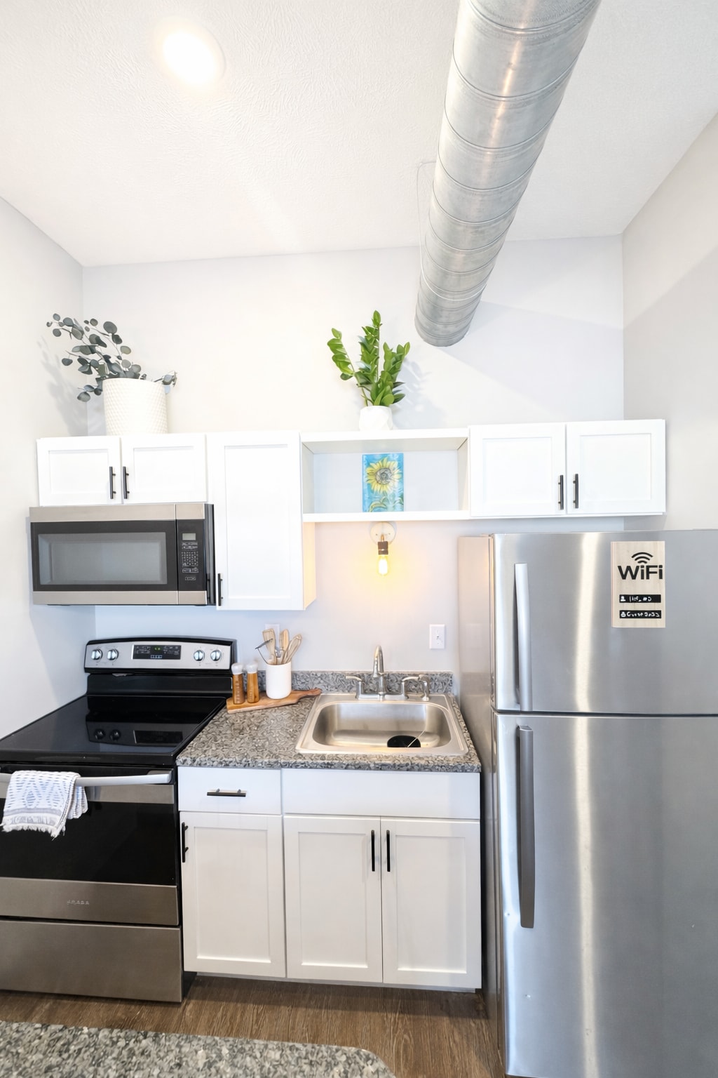 Main level apartment. Kitchen fully stocked for all cooking needs, granite counter tops & stainless steel appliances. Unique dining options & entertainment venues, just short walk away. Hypoallergenic carpeting in bdrms, wood-look luxury vinyl plank flooring rest of apartment & over 10 ft ceilings w/ fans in the living/dining area & all bedrooms. Open floor plan. 43" Roku TV w/ WiFi supplied for guests. Have 1 pack n play for 2 apts so message request for it. 1st request gets may use it