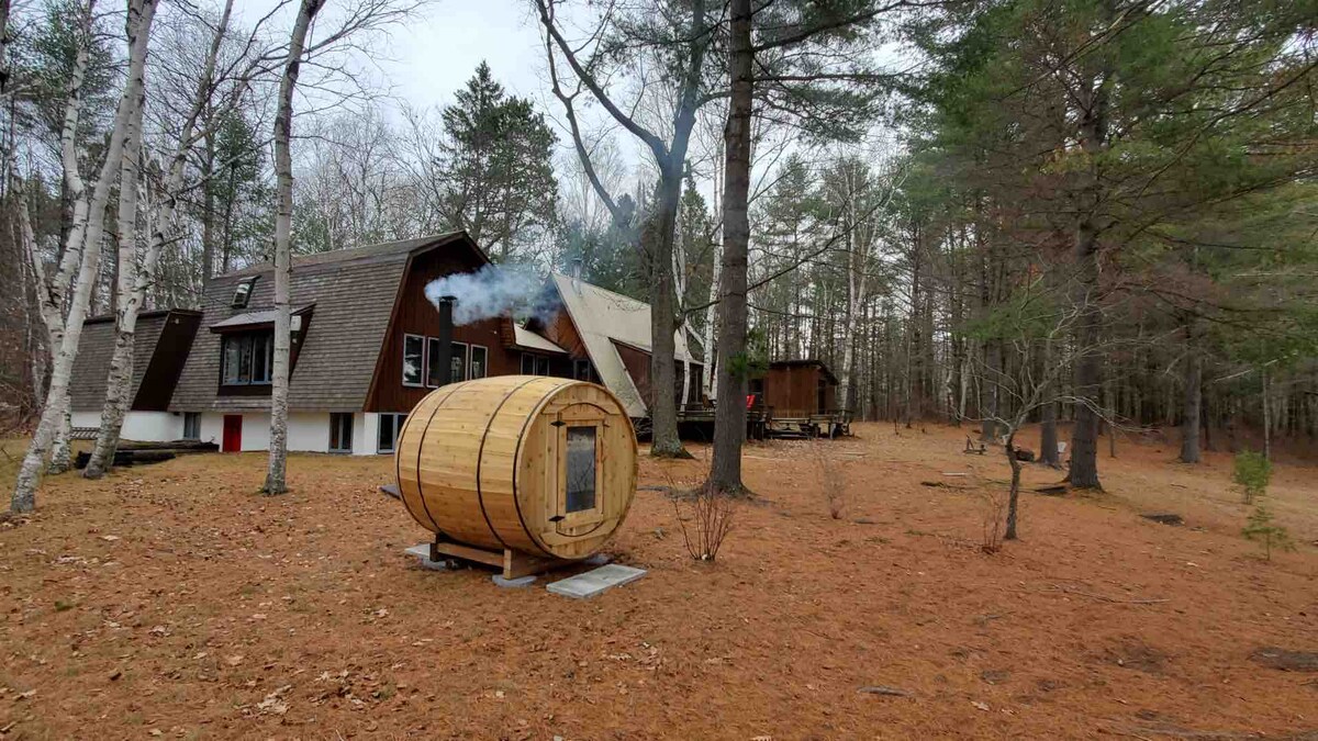 トワイライトフォックスに来て、静かな森の中にあるサウナ、ホットタブ、屋内の暖炉をお楽しみください。エレガントでユニークなコテージで素晴らしい自然体験。驚くほど大きな三角屋根の家、納屋、二段ベッドの家はすべてモダンなコテージの一部です。カップルのロマンチックな休暇には快適ですが、大人数のグループや家族連れにも対応できます。 素晴らしいマダワスカ川/カマニスケグの平和と静けさを満喫しましょう。 アルゴンキンのような森と息をのむようなウォーターフロントの比類のない平和。