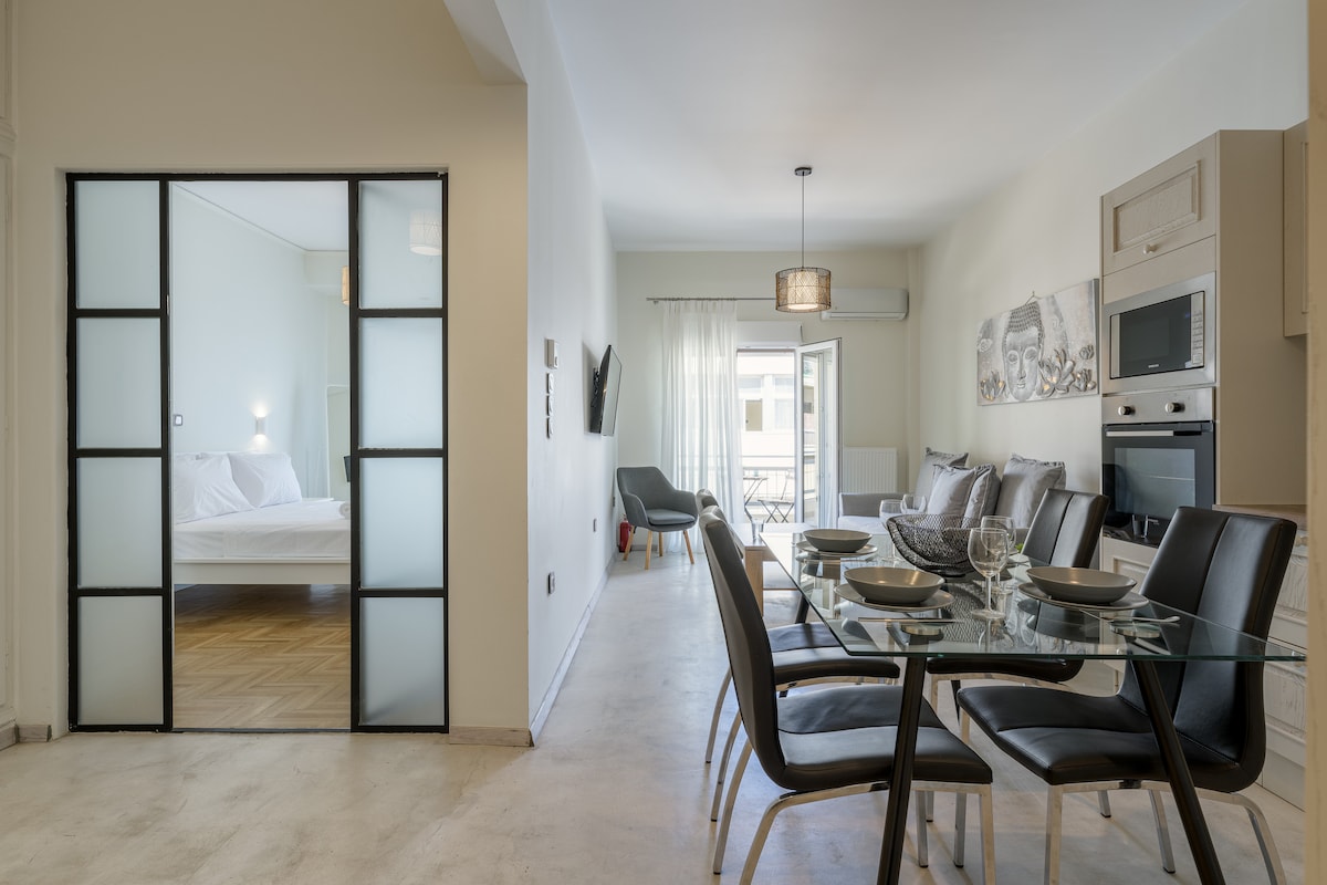 デザインの良いアパートは、有名なコウカキ地区から徒歩4分、アクロポリスから20分の安全で静かなエリアにあります。 ~地下鉄駅と路面電車駅まで徒歩でわずか7分 〜高速Wi-Fi無料 〜高品質のエアコン:冷暖房 ネスプレッソ・ヴェルトゥオ・ポップ 〜洗濯機 〜セルフチェックイン(柔軟) ゲスト専用玄関 ~50インチテレビ 〜路上に無料駐車スペース 〜ベッドが快適 〜信頼できるスーパーホスト