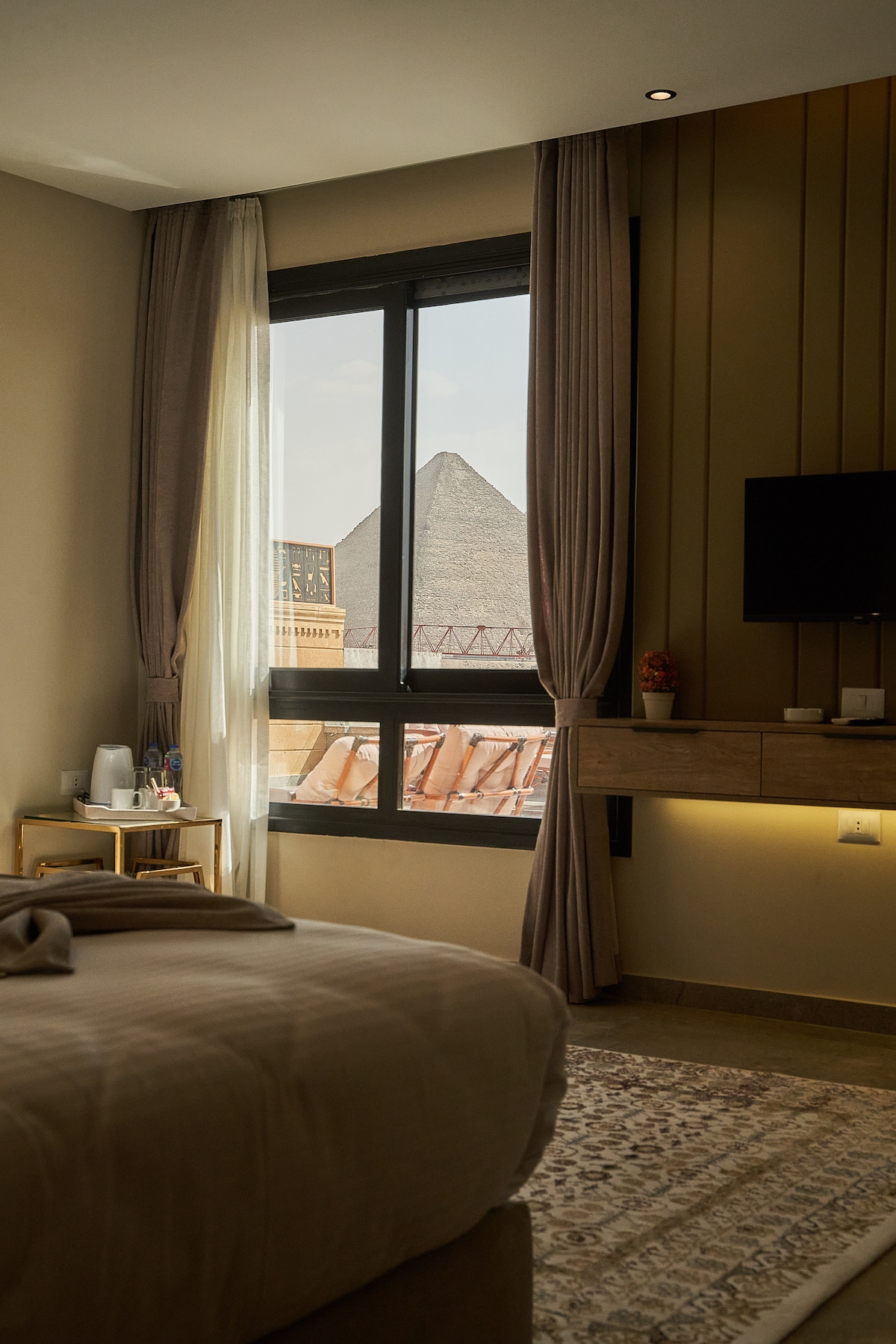 Our boutique hotel features designed rooms. Every room includes a cozy fireplace, minibar, kettle, coffee machine, and microwave. All rooms also have their own private bathroom. The hotel offers a rooftop heated swimming pool with views overlooking the golf course of kattameya Dunes compound. Guests can enjoy relaxing seating areas on the rooftop. We provide a 24-hour reception to assist guests at any time. The hotel also features unique seating areas overlooking waterfalls and fountains.