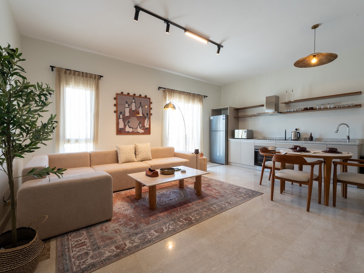 ニューカイロのフィフス・セトルメントにある、快適でスタイリッシュなアパートメント「Cherry Blossom」へようこそ。個室ジムコーナー、仕事専用スペース、リラックスできる読書コーナーなど、客室内ではめずらしい機能をお楽しみください。アパートには2つの高速光ファイバーWi-Fiソースが備わっており、中断のない接続が可能です。快適なクイーンベッド、キッチン、スマートテレビ、静かなパティオが備わっており、出張や静かな休暇に最適です。90ストリート、トップモール、カフェ、すべての必需品からわずか数分。