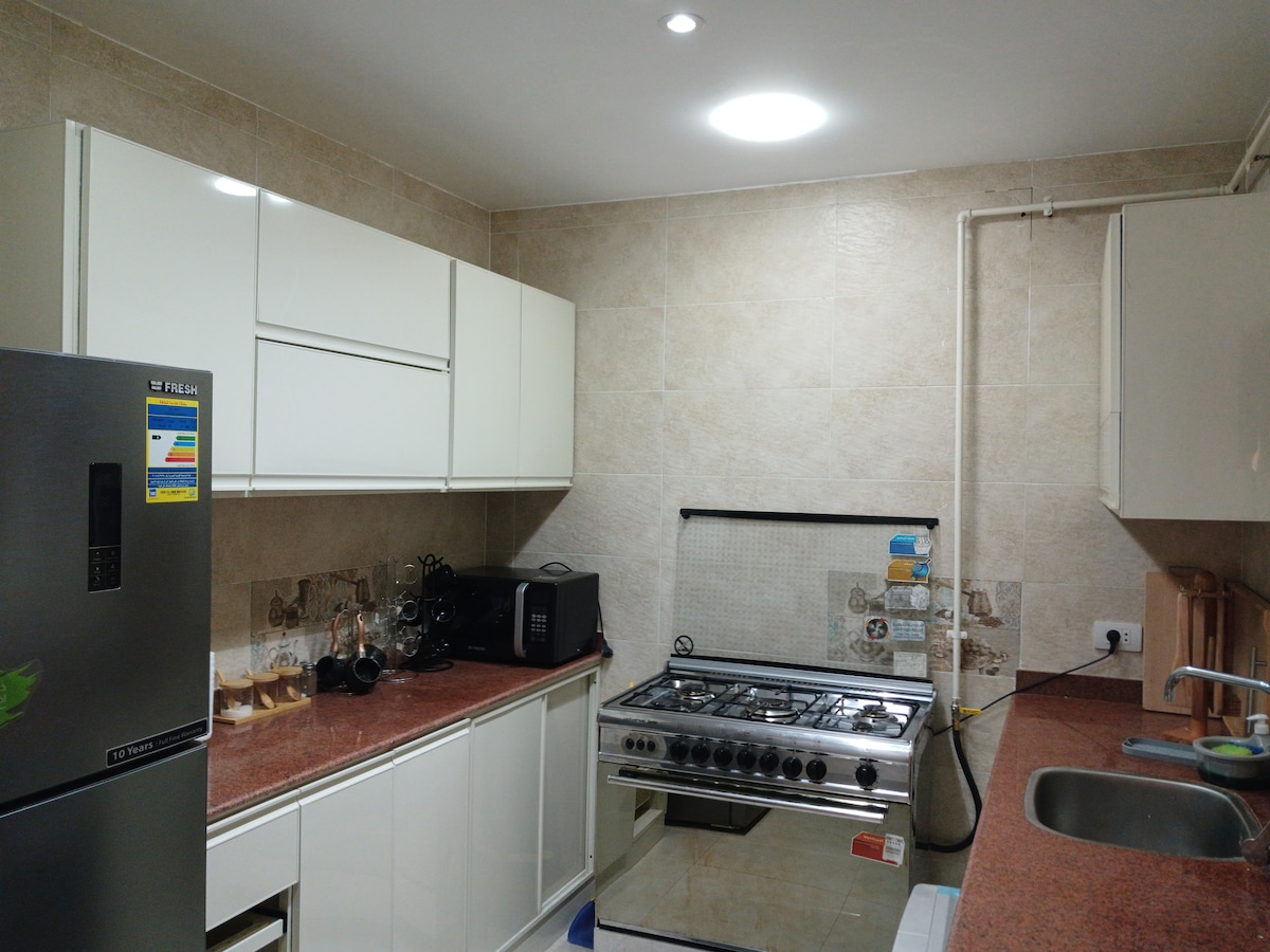 カイロの喧騒から離れた1階の天国で、Waterway 1から車でわずか1分です。 家族全員がのびのび楽しめる最高の宿泊先です。ぜひ、みなさまでお越しください。 このシンプルな2ベッドルームアパートには、キングサイズベッド1台と高品質のマットレスを備えたダブルサイズベッド2台があり、最高の睡眠を提供します。 設備の整ったキッチンとコーヒーマシンで、味覚を満足させましょう! シンプルで必要なものがすべて揃った1.5バスルーム(ホットシャワー、シャンプー、シャワージェルなど)