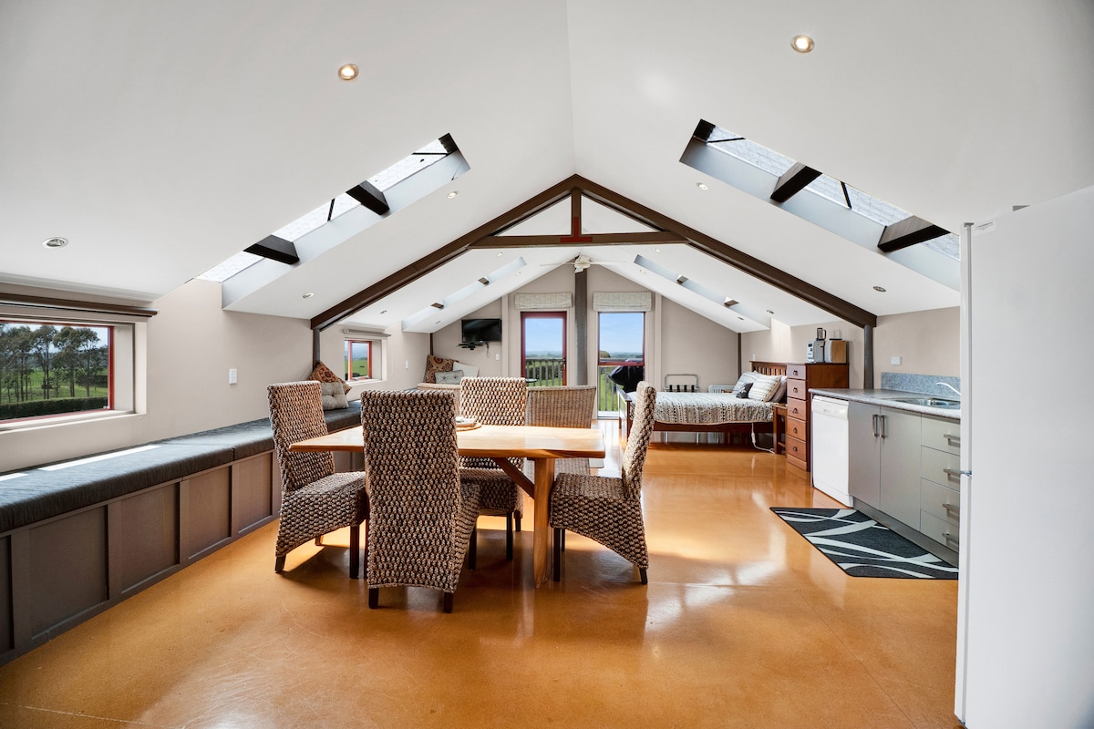特別なゲストはアパート風のリトリートに滞在します。 マスターベッドルームにはクイーンベッド1台、ラウンジにはシングルベッド1台があります。 朝食用のミニキッチンには、シリアル、お茶、コーヒーが用意されており、1日のスタートにぴったりです。 中部北島山脈の東側には素晴らしい景色があり、西側には私たち独自の楽園、タラナキ山があります。 ラウンジは中二階で、下のラウンジに面しています。 ご自身と荷物のためにエレベーターをご利用ください。ドアは階段の右側の2番目にあります。