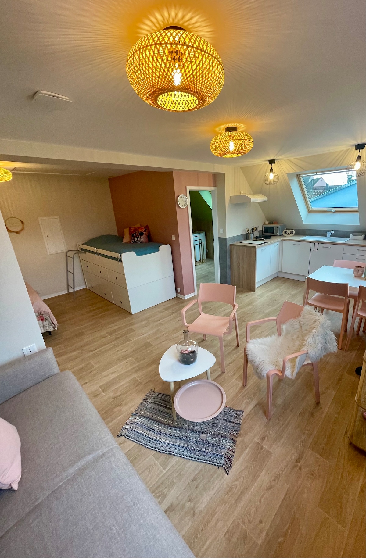 Dans une ancienne grange alsacienne typique en bois, cet appartement de 40 m² en rez-de-chaussée (sans escalier) est idéal pour 2 à 4 personnes. Proche des commerces et doté d’un accès rapide à l’autoroute, il comprend : • Une chambre (lit double : 2×90×200) • Un salon avec canapé convertible (140×190 pour 1 à 2 personnes) • Une cuisine équipée • Une salle de bain avec WC • Une terrasse exposée sud ▷ Parking privatif ▷ Draps et serviettes fournis ▷ Wifi haut débit + Netflix + Prime Video