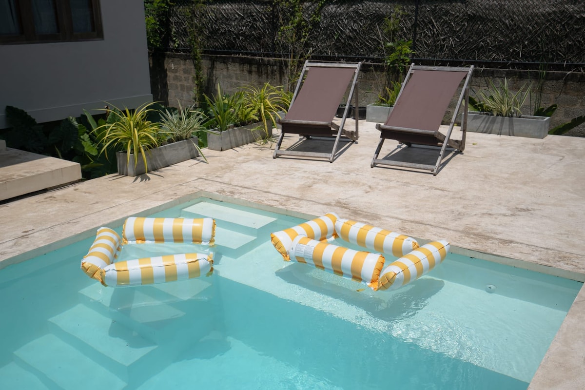 こちらの落ち着いた宿泊先で、ご家族一緒におくつろぎください。広々としたエアコン完備のヴィラで、寝室には4つの広々とした専用バルコニーがあります。2つのバスルームが専用で、1つは共用でお湯が出ます。2つのリビングエリア、設備の整ったオープンキッチン、広々とした屋上。 スーパーマーケットは200m、公共交通機関は75mの距離にあります。ポルヘナビーチまで600m、マディハサーフィンスポットまで1km、ワリガマ観光地まで8km、ミリッサ観光地まで5km。