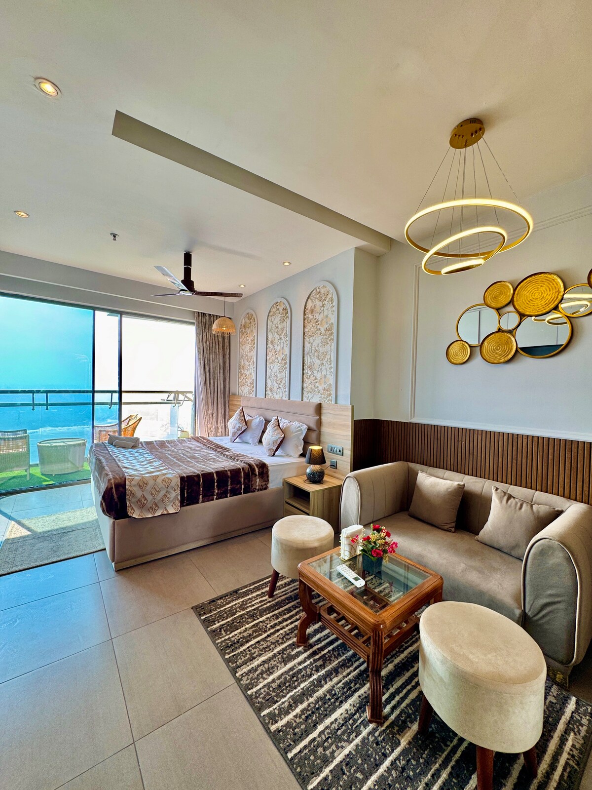 ラグジュアリーアパートメントノイダ|リバービュールーム|プライベートサービスアパートメント|高層ラグジュアリー滞在|バルコニールームノイダ|ビジネス滞在ノイダ プライベートラグジュアリーステュディオアパートメント 31階にあります リバービュー&シティスカイラインビュー 座席付きの専用バルコニー プレミアム寝具付きキングサイズベッド スタイリッシュなソファのシーティングエリア 仕事専用デスク&スマートテレビ 高速Wi-Fi 機能的な簡易キッチン LEDミラー付きのモダンなバスルーム エアコン完備、明るい室内 出張やレジャーの滞在に最適です