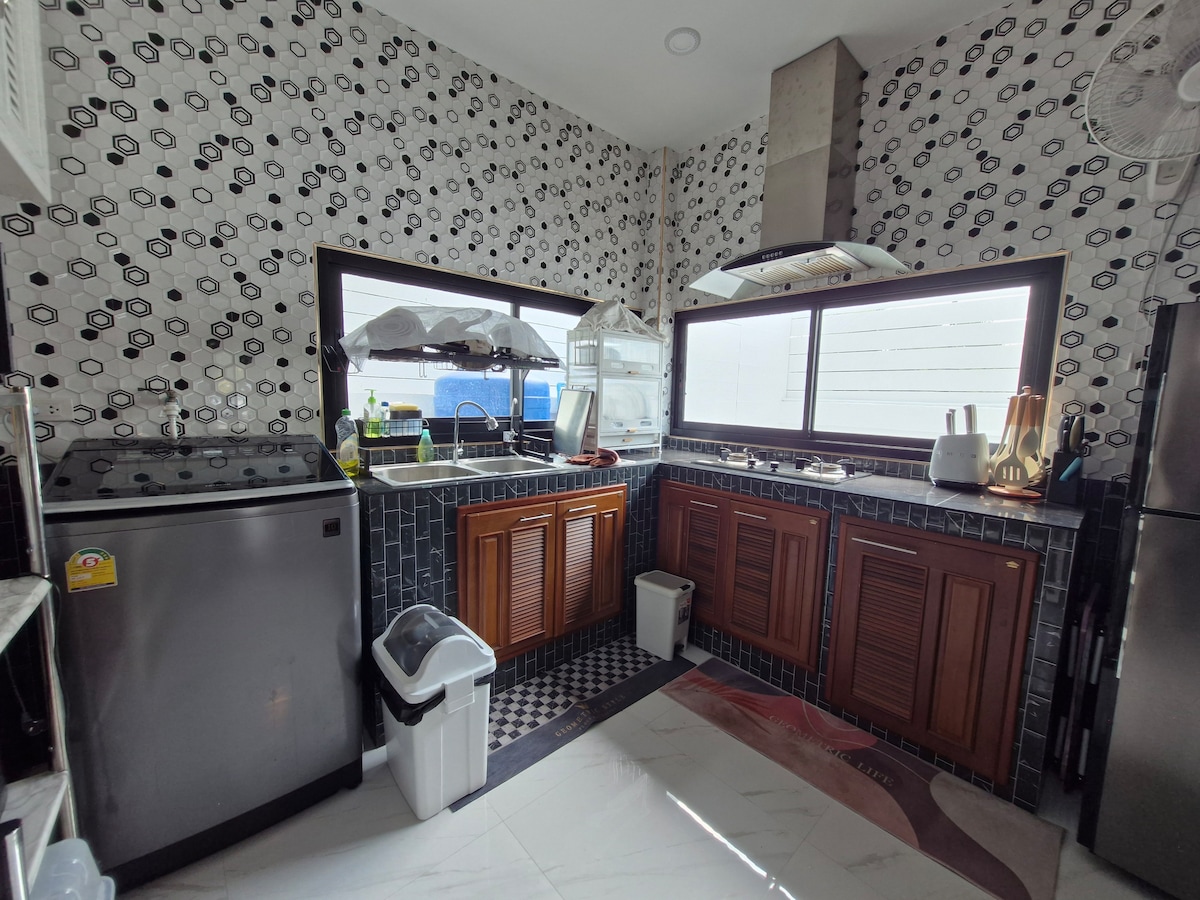 24時間警備のある静かで安全なエリアにある、寝室3室とバスルーム2室を備えた2階建ての家全体。 駐車場2台無料。車をお持ちのご家族連れに最適です。大人6名様と12歳未満のお子様2名様まで無料でご宿泊いただけます(追加ベッドをご用意しています)。 📍セントラルウエストゲート&イケアバンヤイまで5 km、MRTクローンバンファイまで4.5 km。 近くにはセブンイレブン、ロータス、地元の市場があります。GrabとLine Manのエリア内にあります。 設備の整った屋内・屋外タイキッチン、バーベキューグリル、鍋セット、屋外喫煙エリア。リラックスして、自宅のようにお過ごしください。